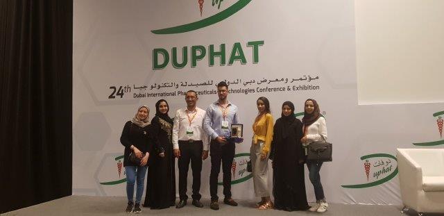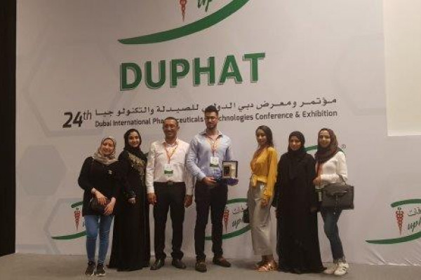A new achievement is being added to the College of Pharmacy and Health Sciences at Ajman University with six awards and advanced places at the Dubai International Pharmaceutical and Technology Exhibition (DUPHAT) at its 24th Annual Session, held at the Dubai International Convention Center that witnessed the participation of researchers, academics, scientists and students from pharmacy and health care sectors from all around the world. The event is the first of its kind in the Gulf, Middle East and North Africa region.
