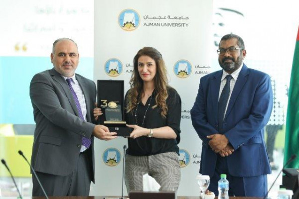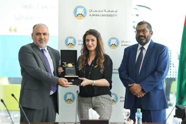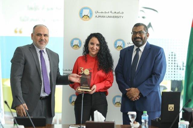 The honoring ceremony saw the presence of Mr. Abdullah Ahmed Al-Taher, Director, AU Library, and Ms. Dahuk Mahanna, Head of Technical Services at the AU Library.