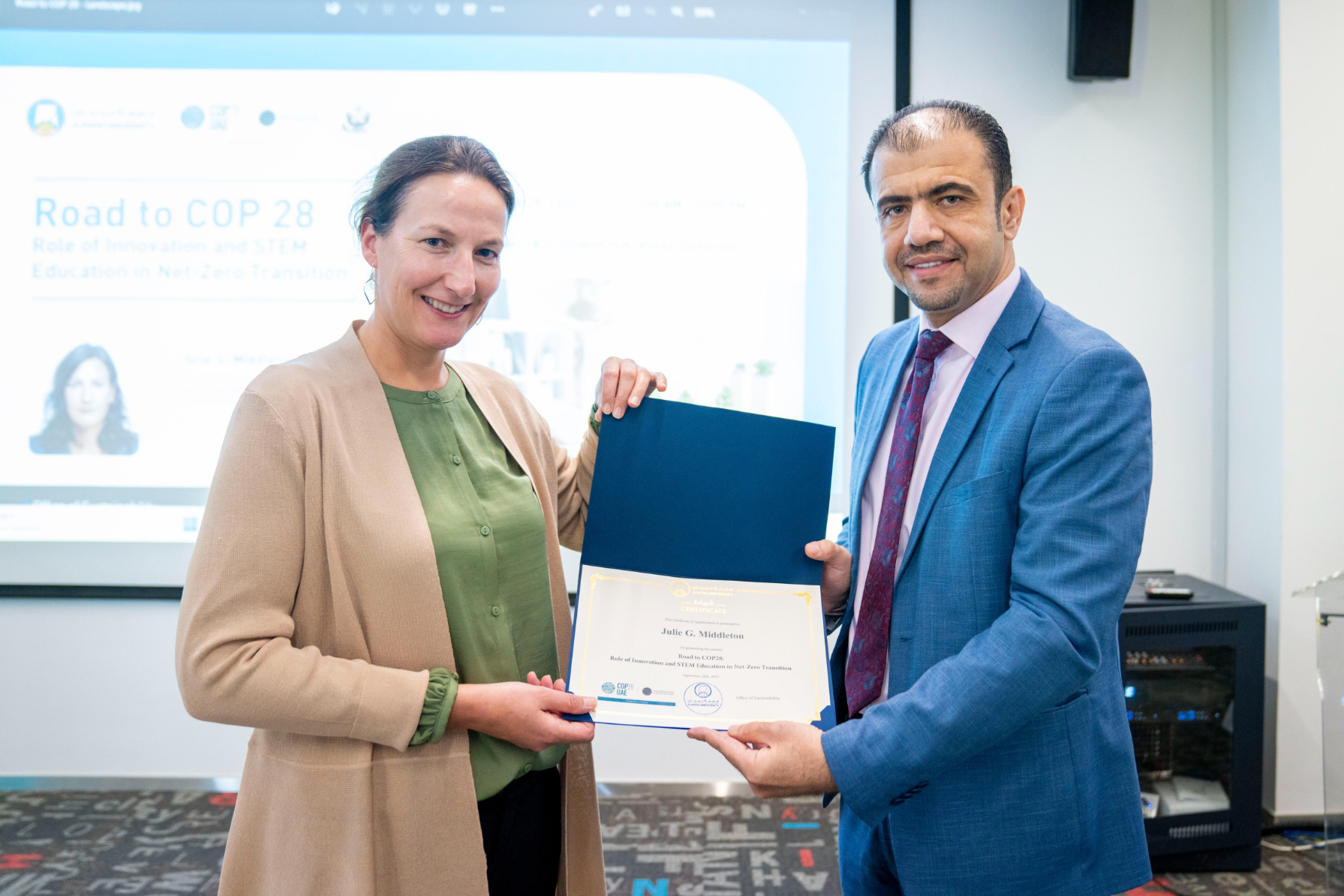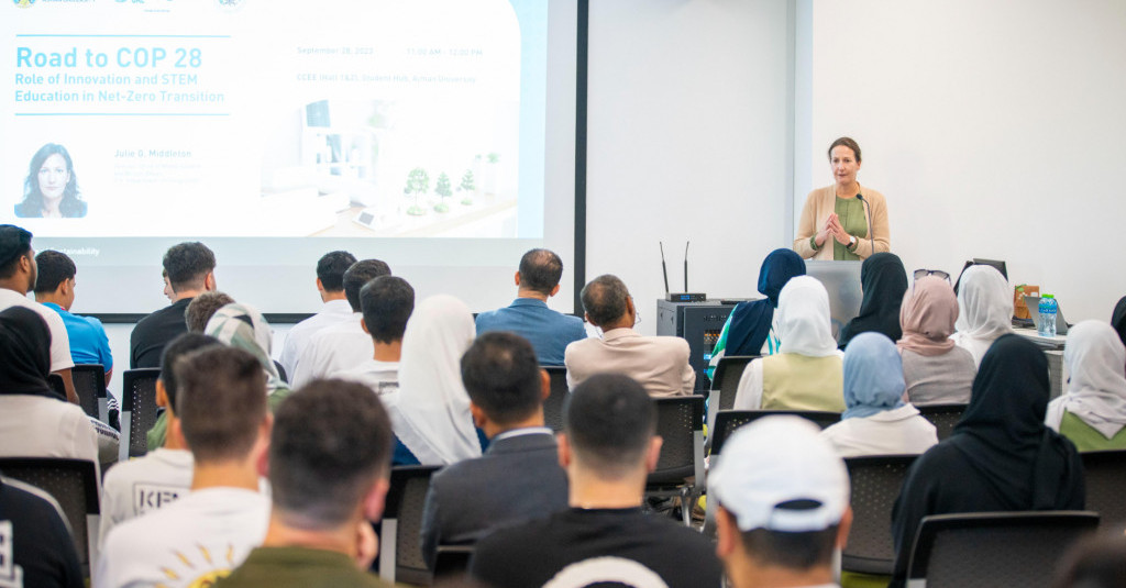 The Office of Sustainability at Ajman University organized an awareness session titled "The Role of Innovation and STEM Education in Net-Zero Transitioning" in collaboration with the United States Mission in the UAE, which was presented by Ms. Julie G. Middleton, Director of the Office of Middle Eastern and African Affairs, U.S. Department of Energy (DOE).