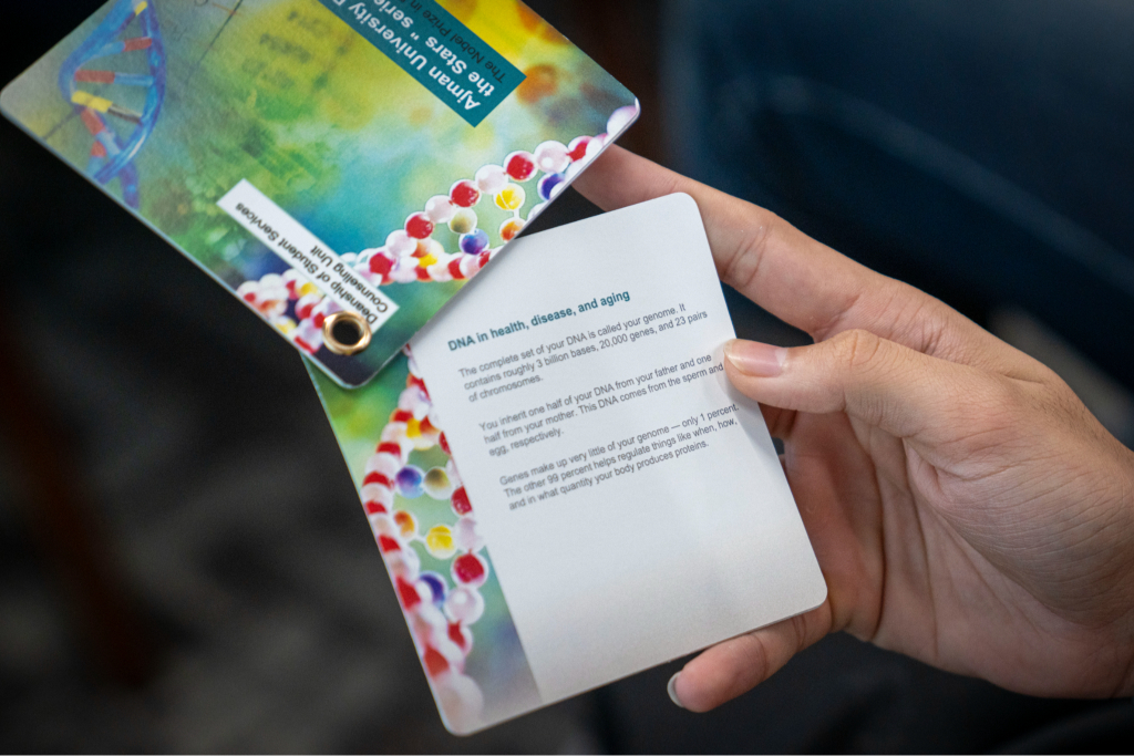 Dr. Gabriel Andrade, Assistant Professor in the College of Medicine at Ajman University, conducted the workshop, shedding light on the Nobel Prize awarded to James Watson, Francis Crick, and Maurice Wilkins for their research on the molecular structure of DNA. These studies contributed to addressing vital biological challenges, representing a prominent turning point in the field of life sciences. Moreover, their studies reshaped our understanding of life and marked the beginning of the era of the biological renaissance.