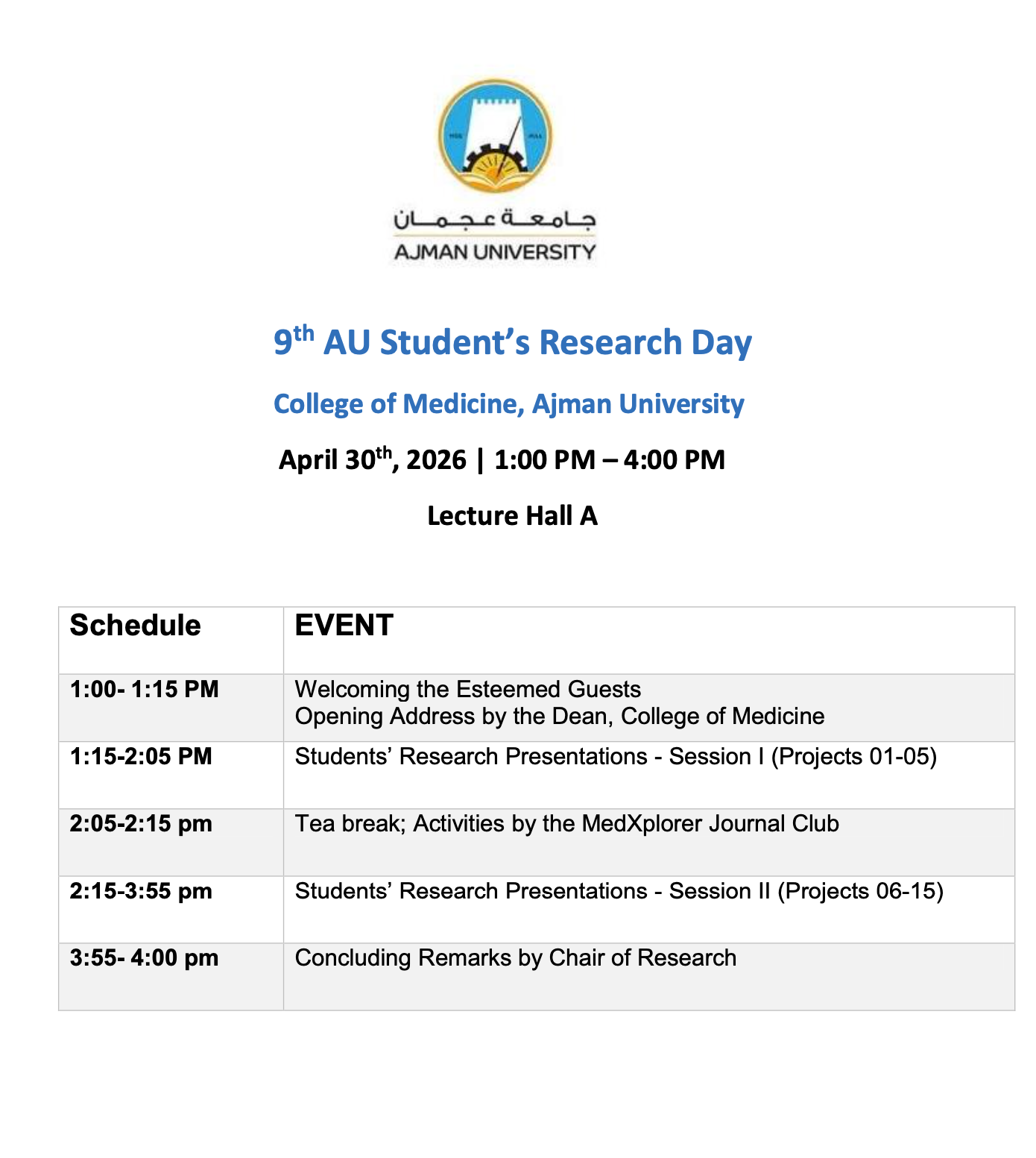 We are pleased to invite all our students to attend Students’ Research Day, AUCOM, 2026, scheduled on 30 April 2026 from 1:00 PM to 4:00 PM at Hall A, Sheikh Zayed Building. This academic event will showcase selected student research projects and celebrate the research efforts, scientific inquiry, and academic excellence of our students. All AUCOM-affiliated students and supervisors are encouraged to attend and support their colleagues.