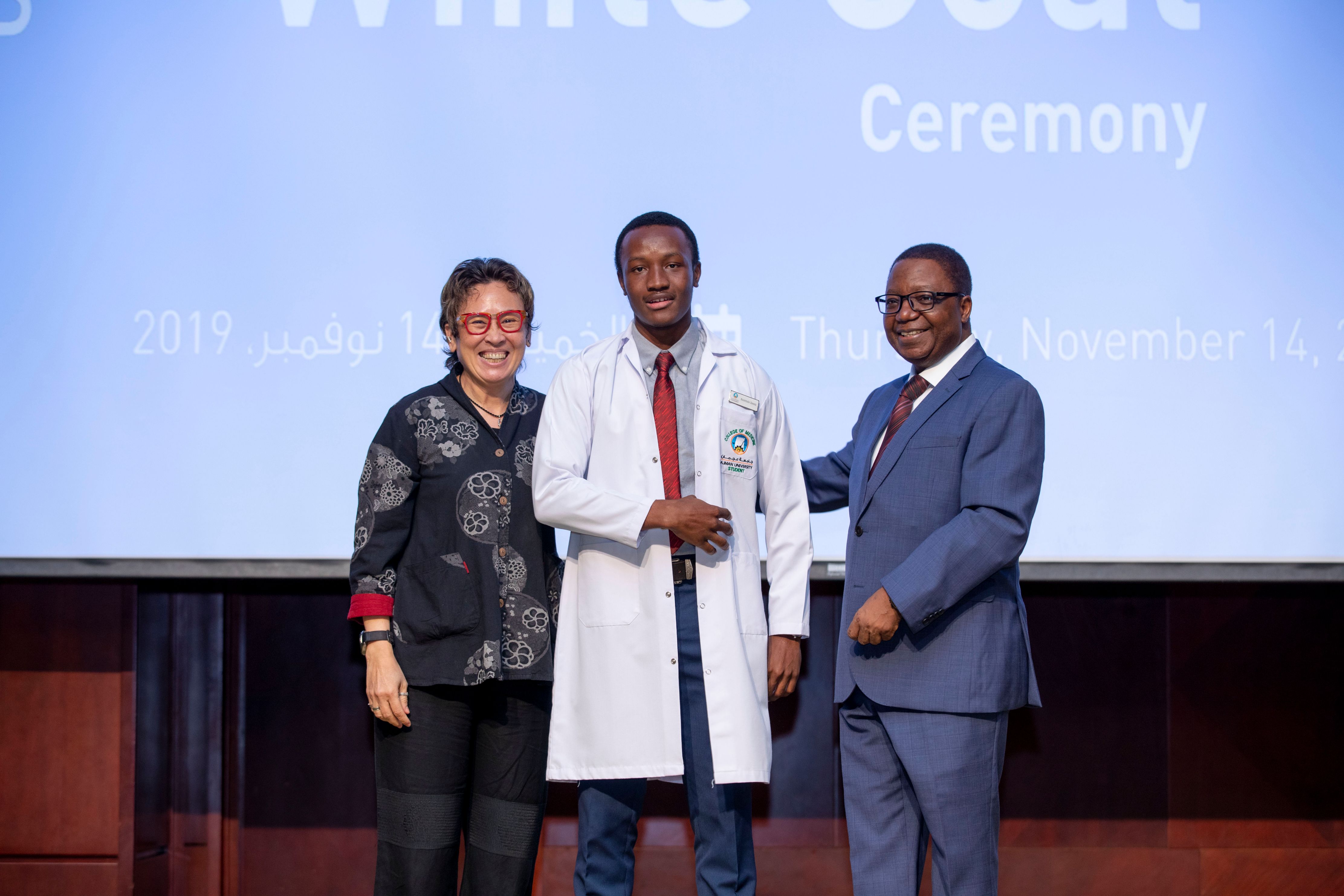 Dr. Solomon Senok, Dean- College of Medicine welcomed the Class of 2024 to the inaugural White Coat Ceremony of the College of Medicine , its highly innovative curriculum and to the limitless opportunities to groom and grow as the next generation of healthcare leaders under the supervision of dedicated and enthusiastic faculty. Professor. Alfreda Stadlin, Professor of Anatomy accompanied the Dean on stage for the White Coat Ceremony which was followed by the Medical Student Honor Code pledge recitation led by the Dean, Dr. Solomon.