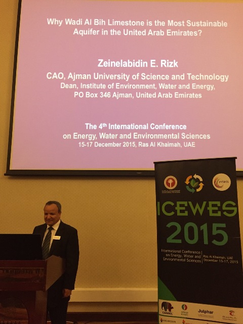 Ajman University is participating in the 4th International Conference on Energy, Water and Environmental Sciences, organized by the American University of Ras Al Khaimah in cooperation with the International Canadian Association for Sharing Knowledge and Sustainability (IASKS), during the period 15-17 December 2015. He is presenting a scientific paper titled “Why Wadi Al Bih Limestone is the Most Sustainable Aquifer in the United Arab Emirates?”.