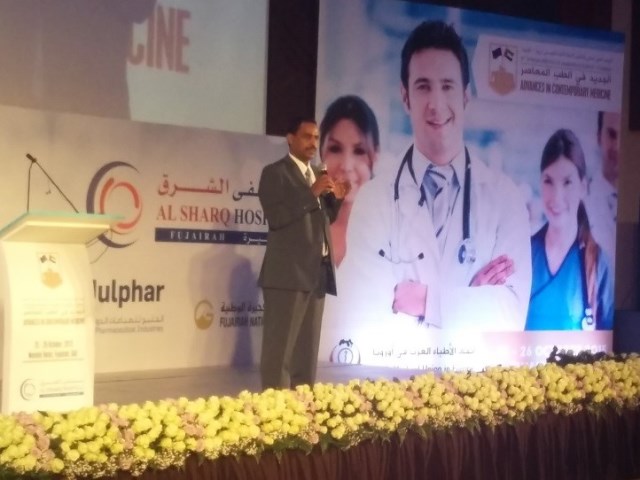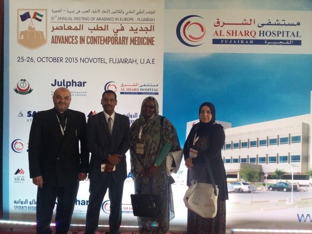 Ajman University of Science and Technology, Fujairah campus participated in the 31st annual meeting of ARABMED Europe held in the Emirate of Fujairah. Under the Patronage of His Highness Sheikh Hamad bin Mohammed Al Sharqi, Supreme Council Member and Ruler of Fujairah and in the presence of His Highness Sheikh Mohammed bin Hamad bin Mohammed Al Sharqi, Crown Prince of Fujairah and Sheikh Dr. Rashid bin Hamad bin Mohammed Al Sharqi, Chairman of Fujairah Culture and Media Authority, and Sheikh Maktoum bin Hamad Al Sharqi, Chairman of Fujairah Sports and Cultural Club and Shaikh Saleh bin Mohammed Al Sharqi, Chairman, Chamber of Commerce and Industry in Fujairah and Sheikh Hamad Bin Saleh Al Sharqi, Chairman of the Al-Sharq Health Care Administration and a number of senior officials, heads and directors of federal and local departments in Fujairah and a group of prominent Health Care Professionals and specialists in the United Arab Emirates along with Arab doctors in Europe under the supervision of the Al-Sharq Hospital in Fujairah.