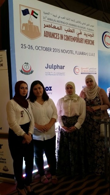Ajman University participated with a delegation comprised of Prof. Ali Ahmed Aboul Nour, Fujairah Campus Director and Prof. Sumia Sirelkhatim Mohamed, Deputy Dean of the College of Pharmacy and Health Sciences and Dr. Ali Abdul Wahab Al-Razzuqi, Deputy Dean of the College of Dentistry in addition to professors from both colleges and a group of students from different academic levels. The university was keen to invite last year's graduates to attend the conference as a part of its commitment towards continuous development of academic skills of graduated students and keeping them constantly updated on the latest research developments.
