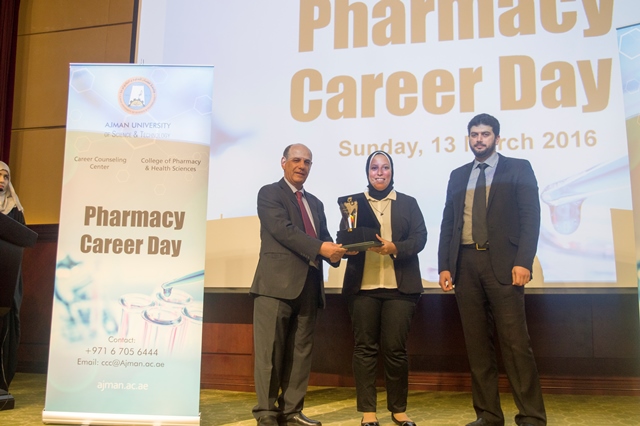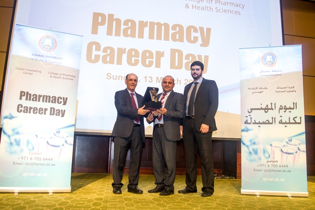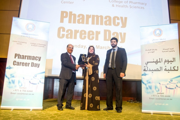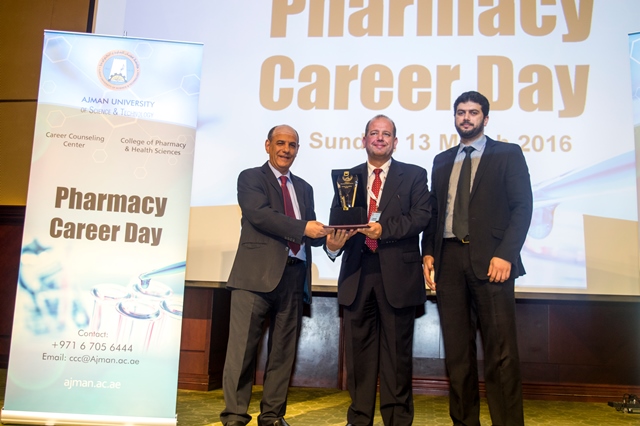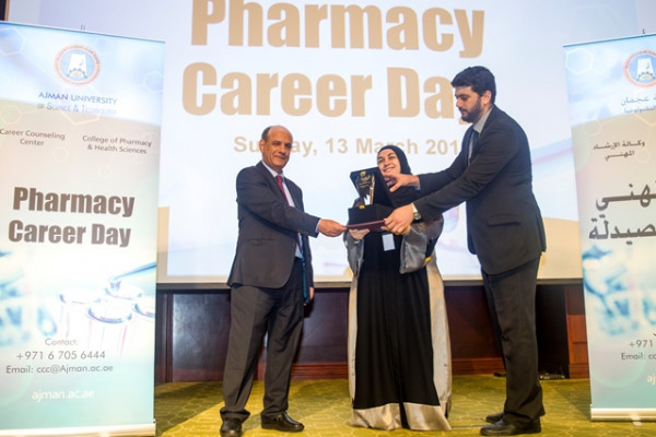 Prof. Ankit stated that Ajman University really values its alumni, which currently exceed 29000 they encompass the values and ideology that the University stands for. In an honoring ceremony to commemorate the ending of a great Pharmacy Career Day, Prof. Ahmed Ankit and Prof. Nageeb Hassan honored the speakers and organizers for their dedication and hard work.