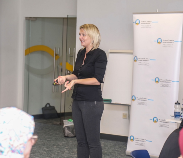 The panel consisted of Dr. Karim Al Seghir, AU Chancellor, Sheikha Dr. Nahla, Dean of Student Affairs, Dr. Chuloh Jung, Director of AUIC, Engineer Baloola, Deputy Director, AUIC, Tarek Ismail, deputy director Sheraa, Jean-Luc, founder of Inneplois, members from Ajman Police, Ajman Government and AU faculty members.