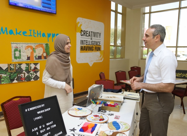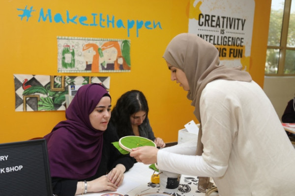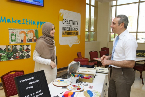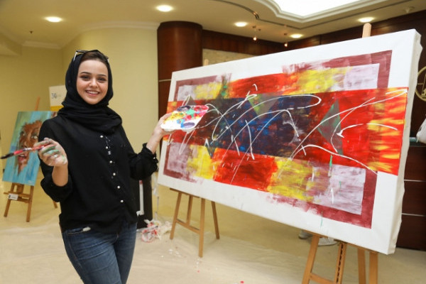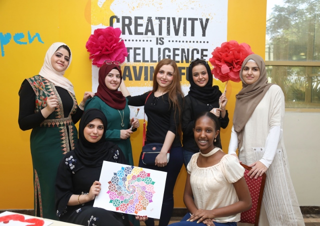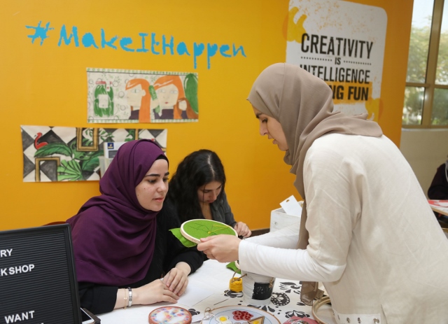 The Carnival showcased he completion of an acrylic fresco in a record time by student Aya Al Saadoun of the College of Engineering, an associate of the Fine Arts Center. The Carnival offered a series of workshops including Mandela making, needlework, oil painting, acrylic painting, artwork, graphics, glass painting, and water painting.