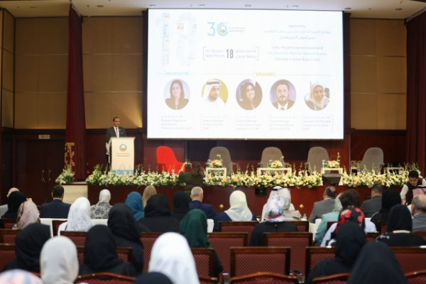 Israa Shaheen, College of Business Administration ‘96, moderated the forum. She is a highly respected business etiquette and international protocol consultant in the UAE. Each of the Forum panelists enjoy successful careers and are alumni of AU: Mohammad Atta Rajab, College of Engineering ’94 and General Manager of Dar Al Najat Medical Technology Company in Saudi Arabia; Hashem Salem, College of Engineering ‘12 and General Manager of Al Owais Holding Company; Sabrin Abdo, College of Business Administration ‘10 and General Manager of Fadia Al Taweel Event Management; and, Niveen Al Gharabli, College of Information Technology ‘95 and Assistant Vice President, Sharjah Islamic Bank.