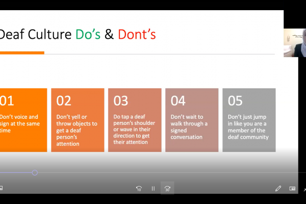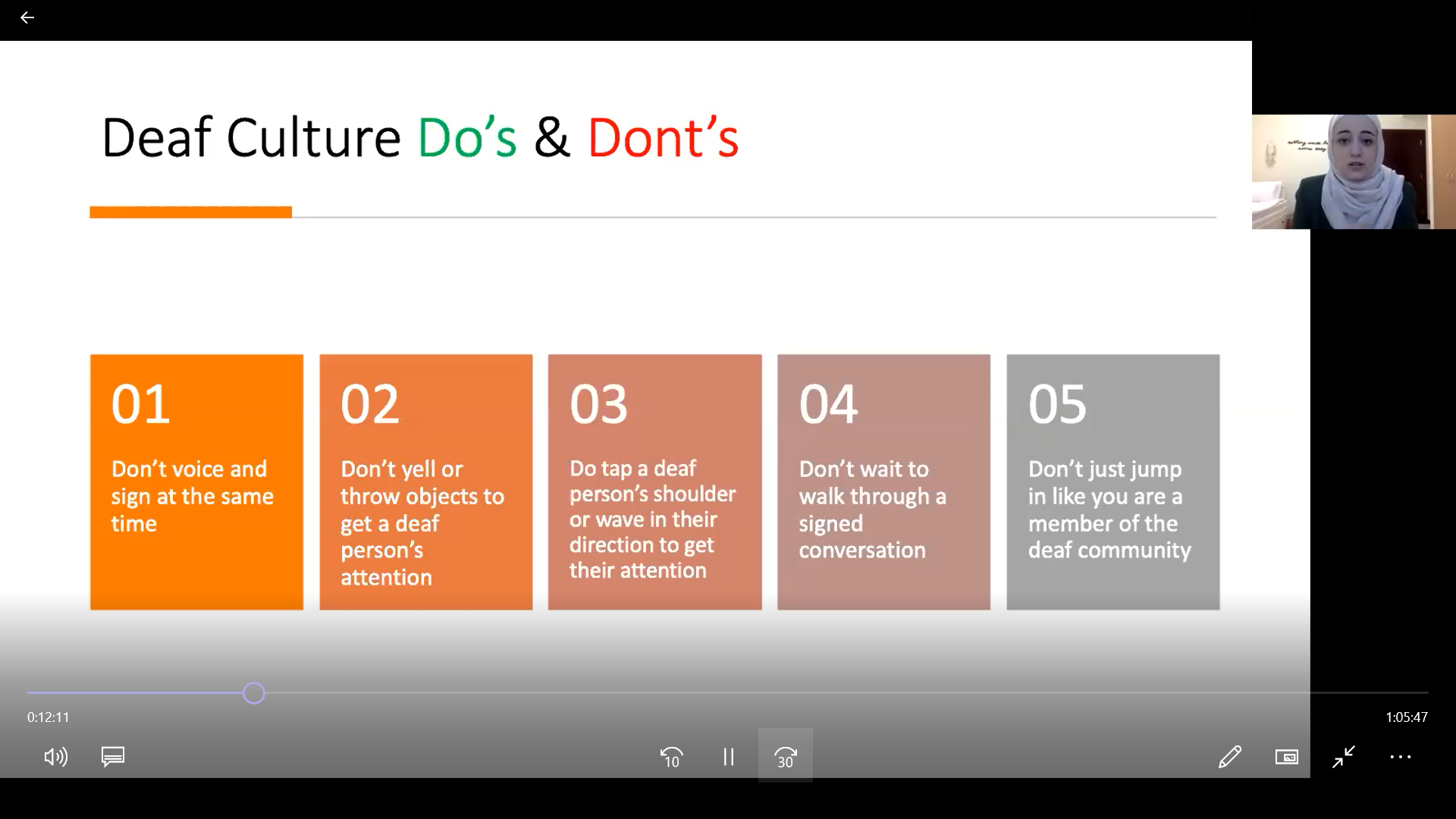Ajman University is also committed to facilitating learning and development of the differently abled. In order to sensitize staff and train them in the needs of the hearing impaired, one of our enterprising staff, Nada Shahin, Administrator and Certified Trainer in the Office of IT, delivered a webinar titled “American Sign Language”. The session helped our staff understand the nuances of sign language meant to communicate with deaf people.