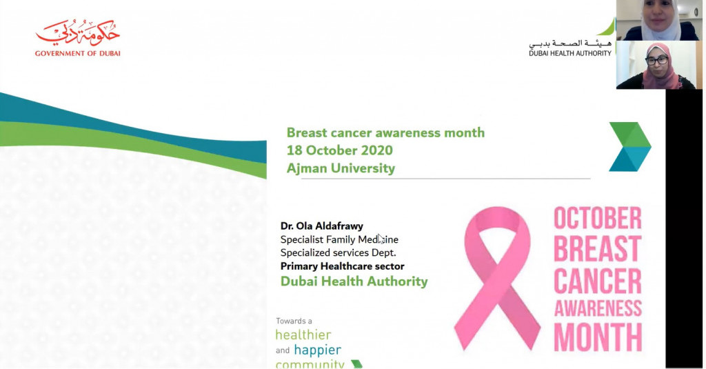 In order to raise awareness about breast cancer, Ajman University ran a Breast Cancer Awareness Campaign, in coordination with the Dubai Health Authority, which comprised a series of highly informative webinars. In one of the webinars titled, “One on one Discussion with the Breast Cancer Winners,” AU hosted 4 women breast cancer survivors from Australia, Egypt, India and Lebanon who spoke about their experiences and fight with breast cancer.