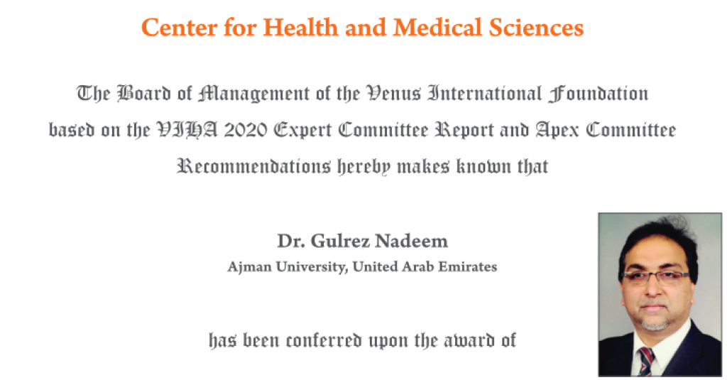 Dr. Gulrez Nadeem, Assistant Professor at Ajman University’s College of Dentistry has been recognized for his excellence in the field of surgical anatomy by India-based Venus International Foundation.