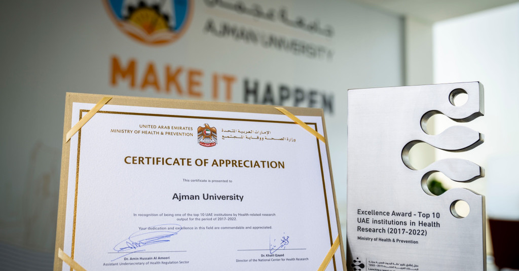 Ajman University has added another feather to its cap by winning two Excellence Awards in the category of the Top 10 UAE institutions in Medical and Health Research. These prestigious awards were presented by the National Centre for Health Research at the Ministry of Health and Prevention during the launch of their comprehensive report on the Landscape of Health Research in the UAE (2017 – 2022). The report aimed to extract valuable insights from the Health Research database, which collated data from various sources, such as health facilities, institutes and universities over the past five years.