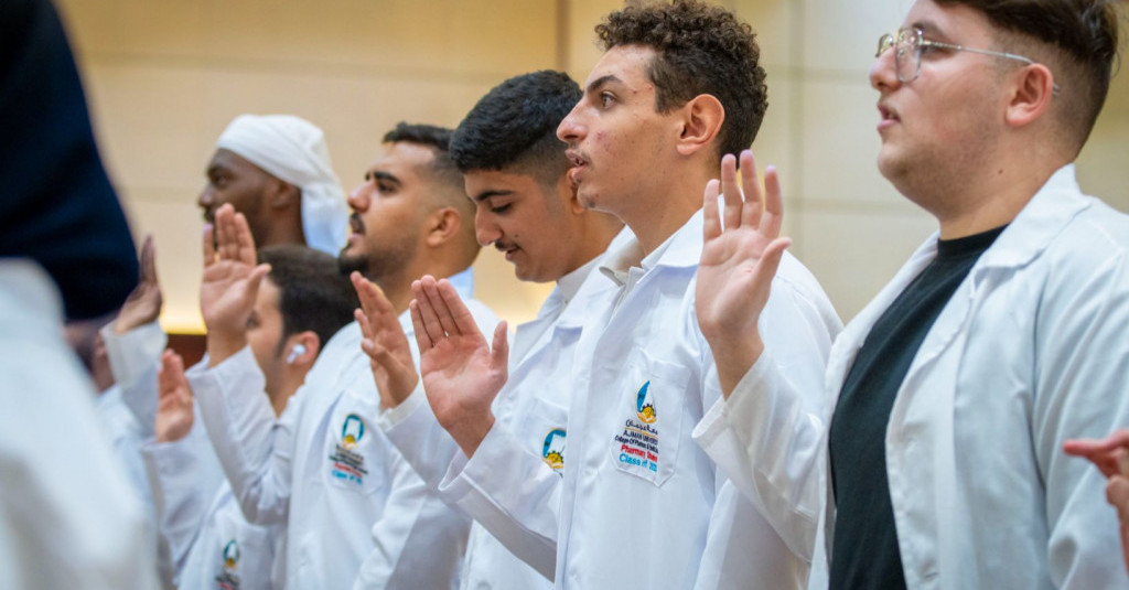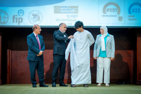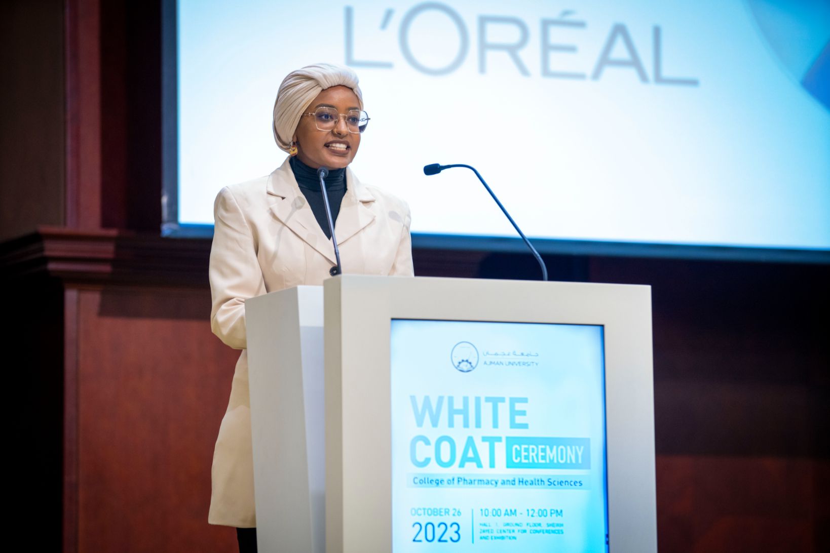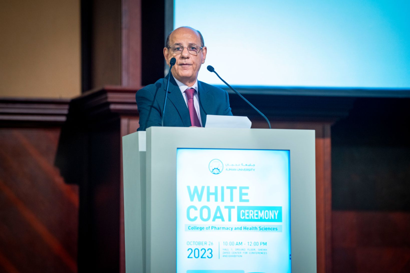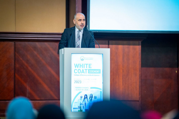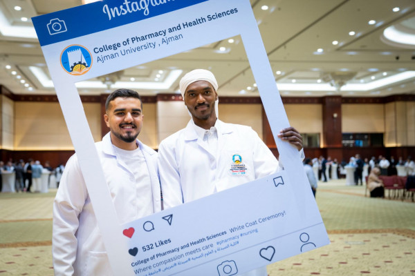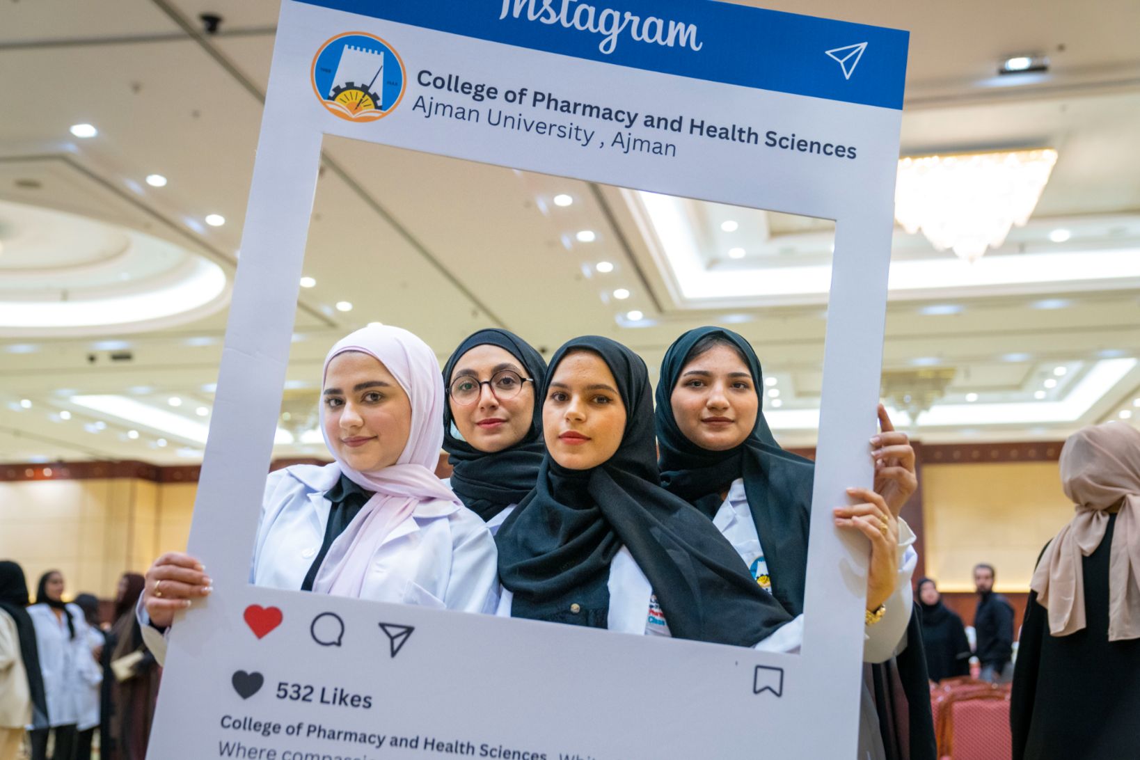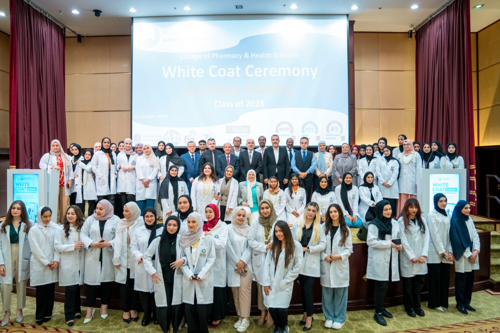 The College of Pharmacy and Health Sciences at Ajman University organized the White Coat Ceremony, for new Pharmacy students at the College. This event is aimed at fostering a sense of responsibility among students and raising awareness about the crucial role of pharmacists in serving the community.