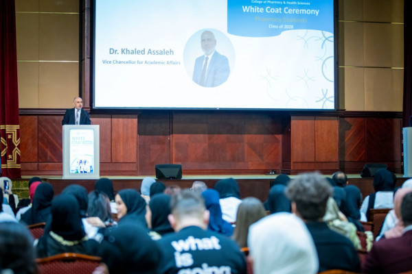 Distinguished attendees include Prof. Khaled Assaleh, Vice Chancellor for Academic Affairs, and Prof. Nageeb Hassan, Dean of the College of Pharmacy and Health Sciences, alongside faculty, students, and parents.