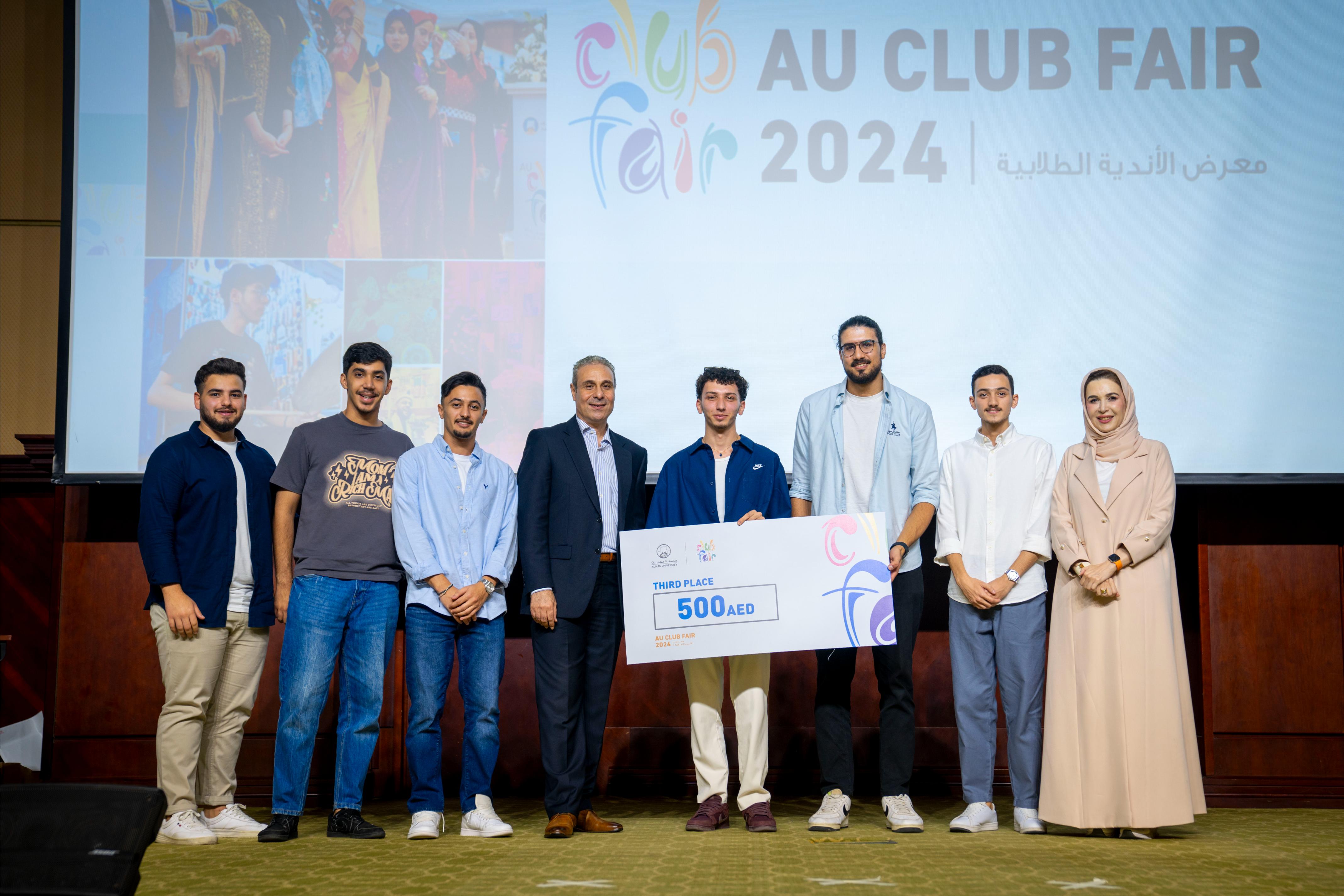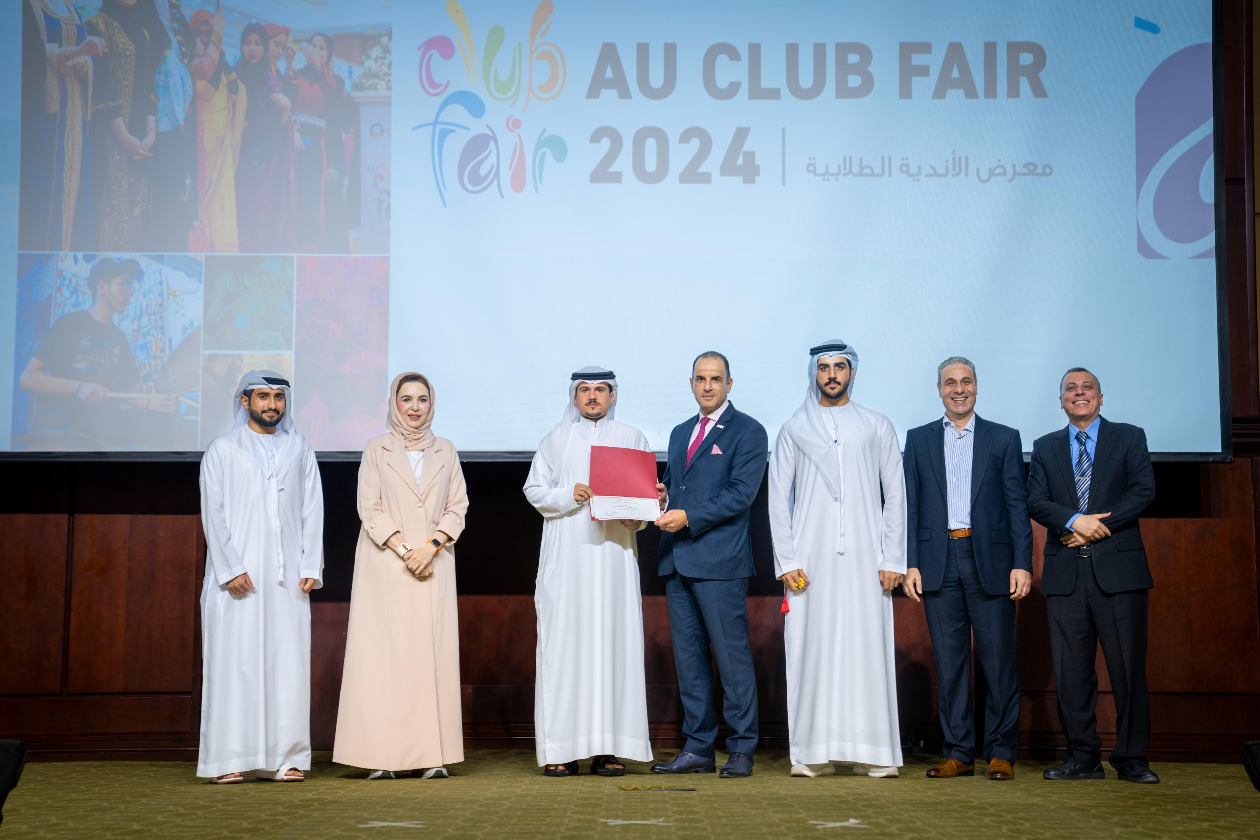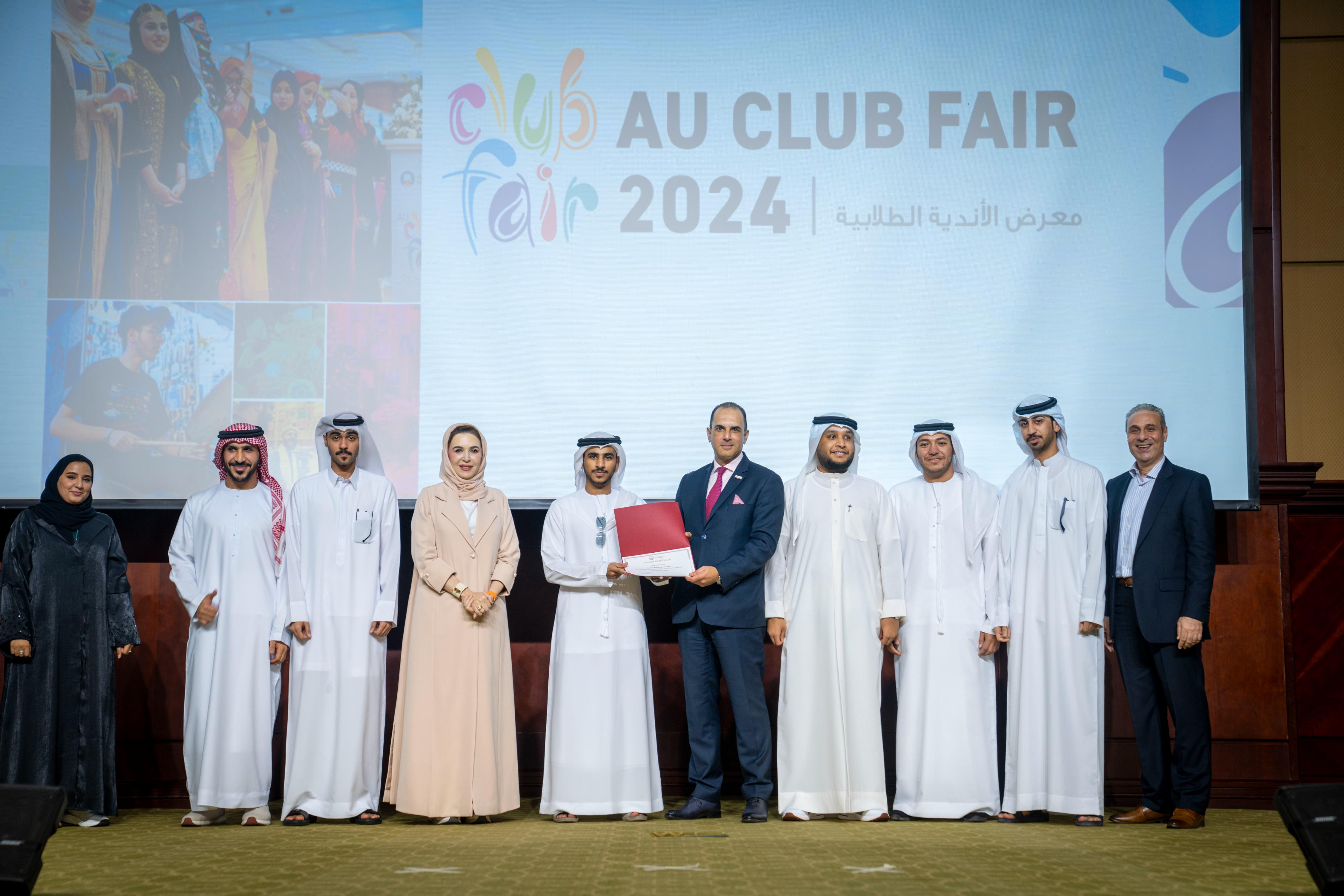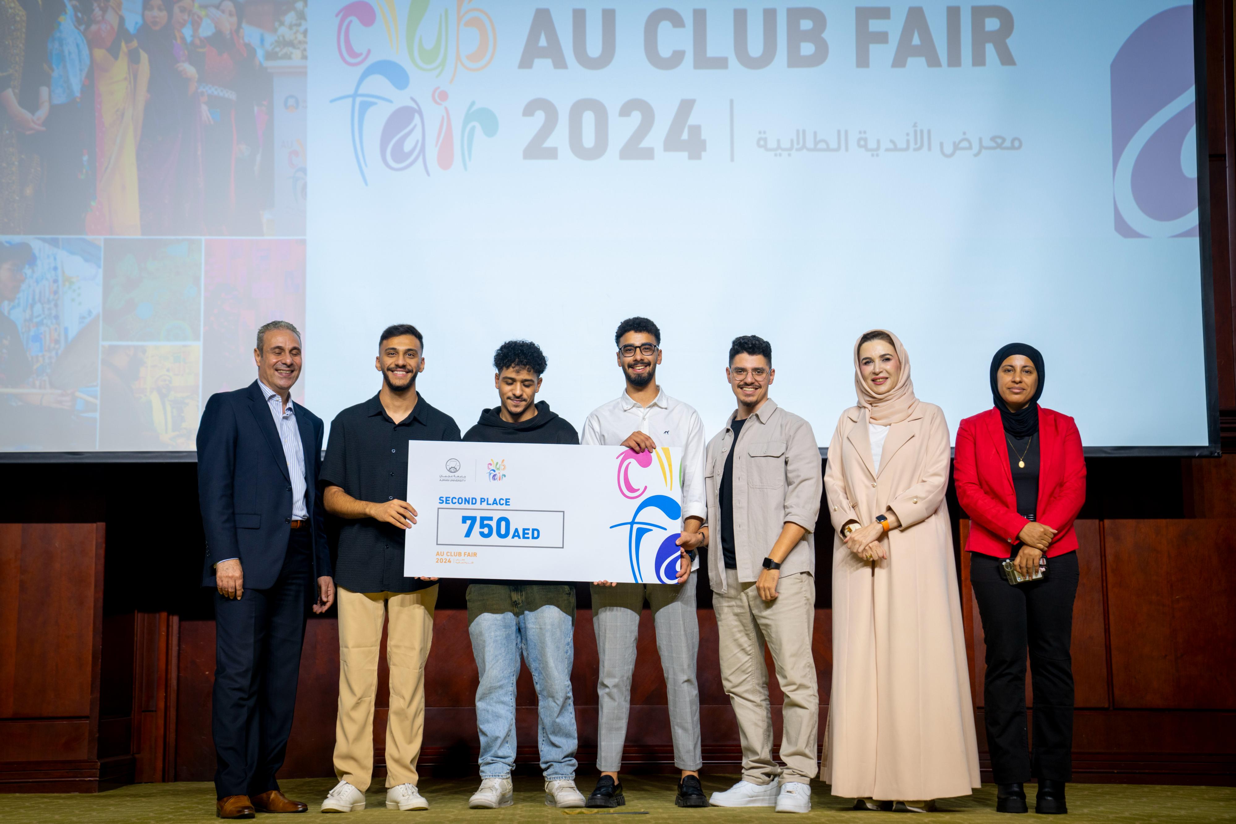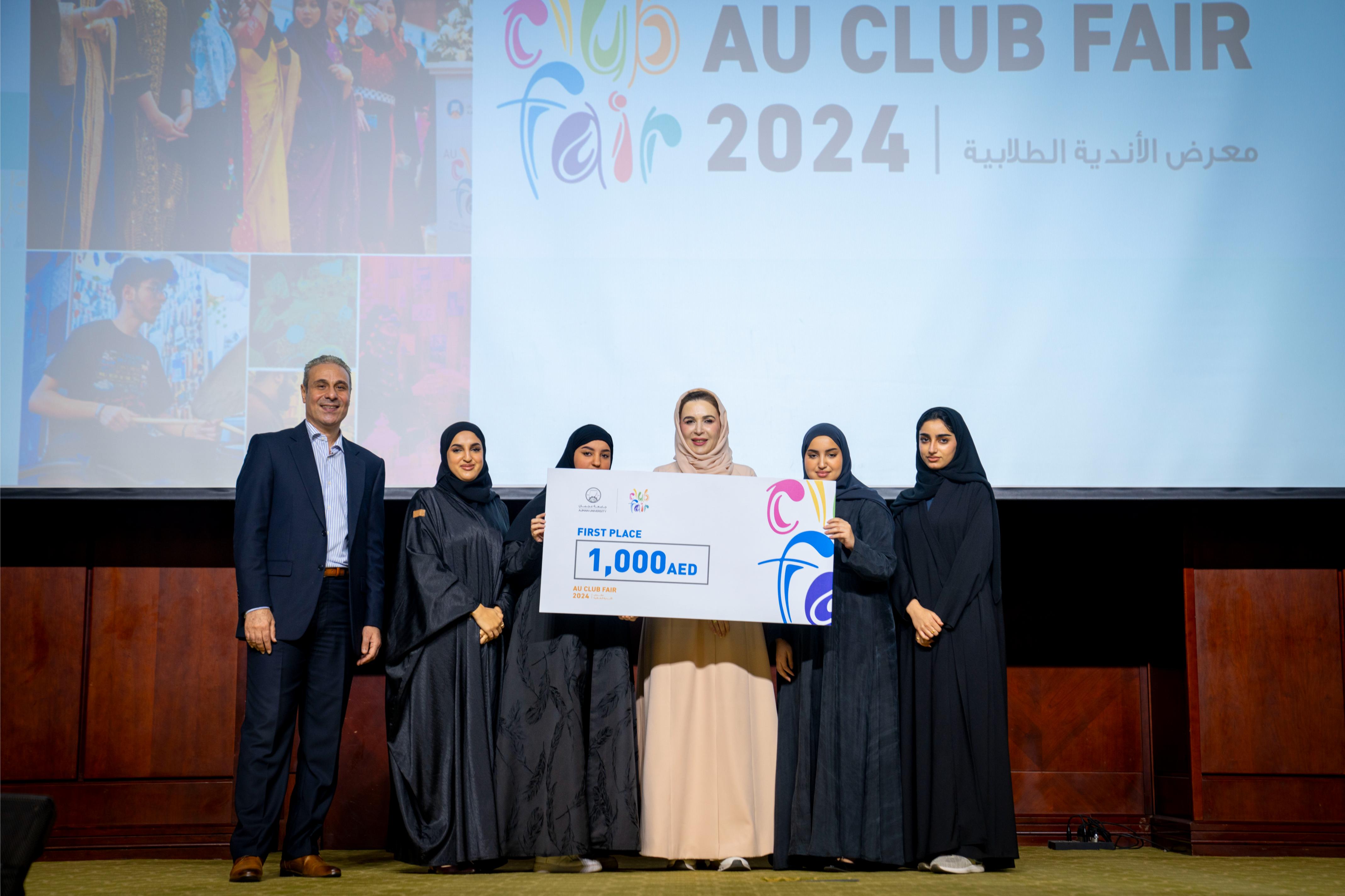 The Office of Student Life at Ajman University hosted a ceremony to honor the outstanding student clubs in the 2024 Student Club Fair. The event was attended by Dr. Karim Seghir, Chancellor of Ajman University, Dr. Nahla Al Qassimi, Dean of Student Services, and Dr. Mohamed Helal, Director of Student Life. Awards were presented to the winning clubs in various categories, recognizing their contributions and achievements.