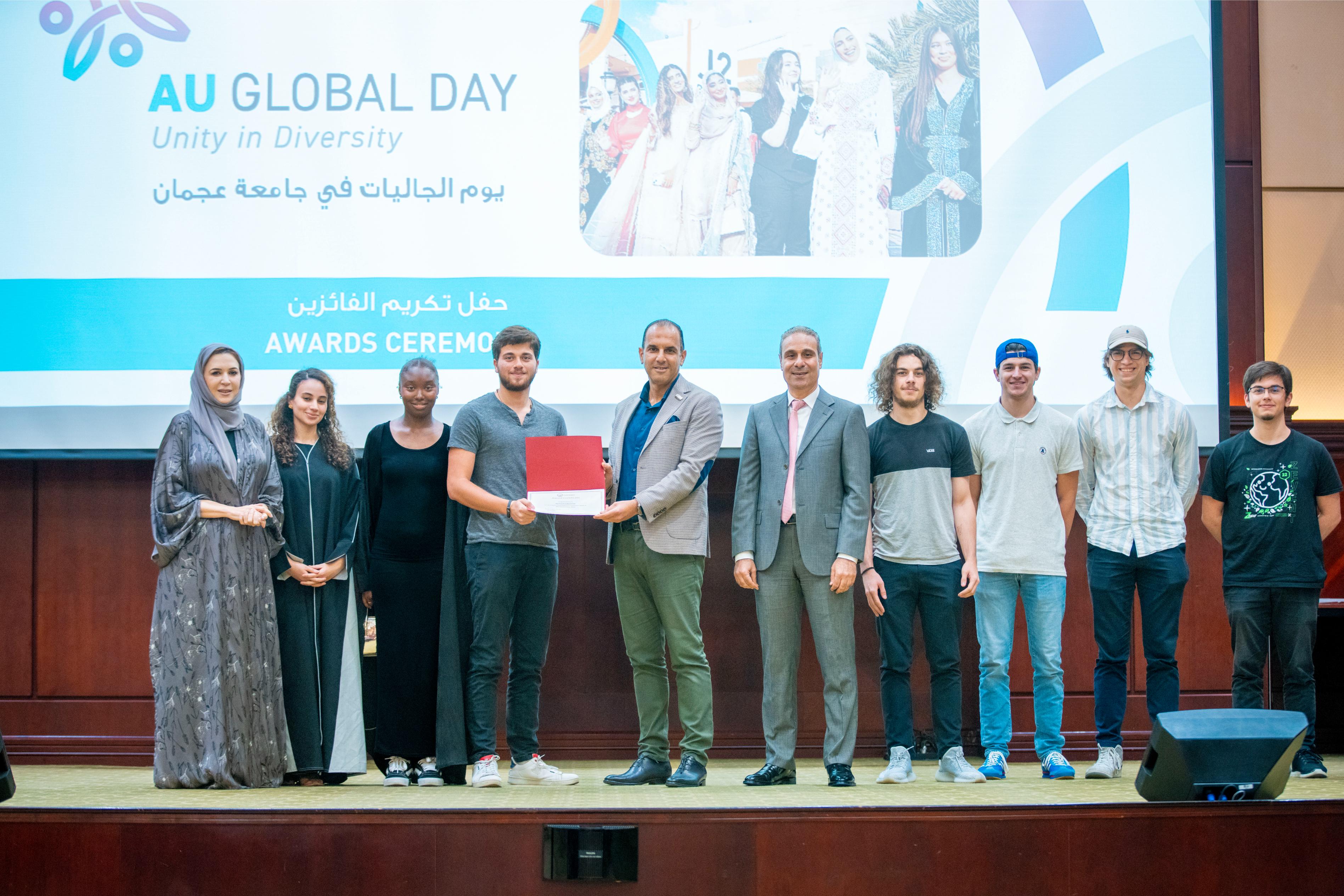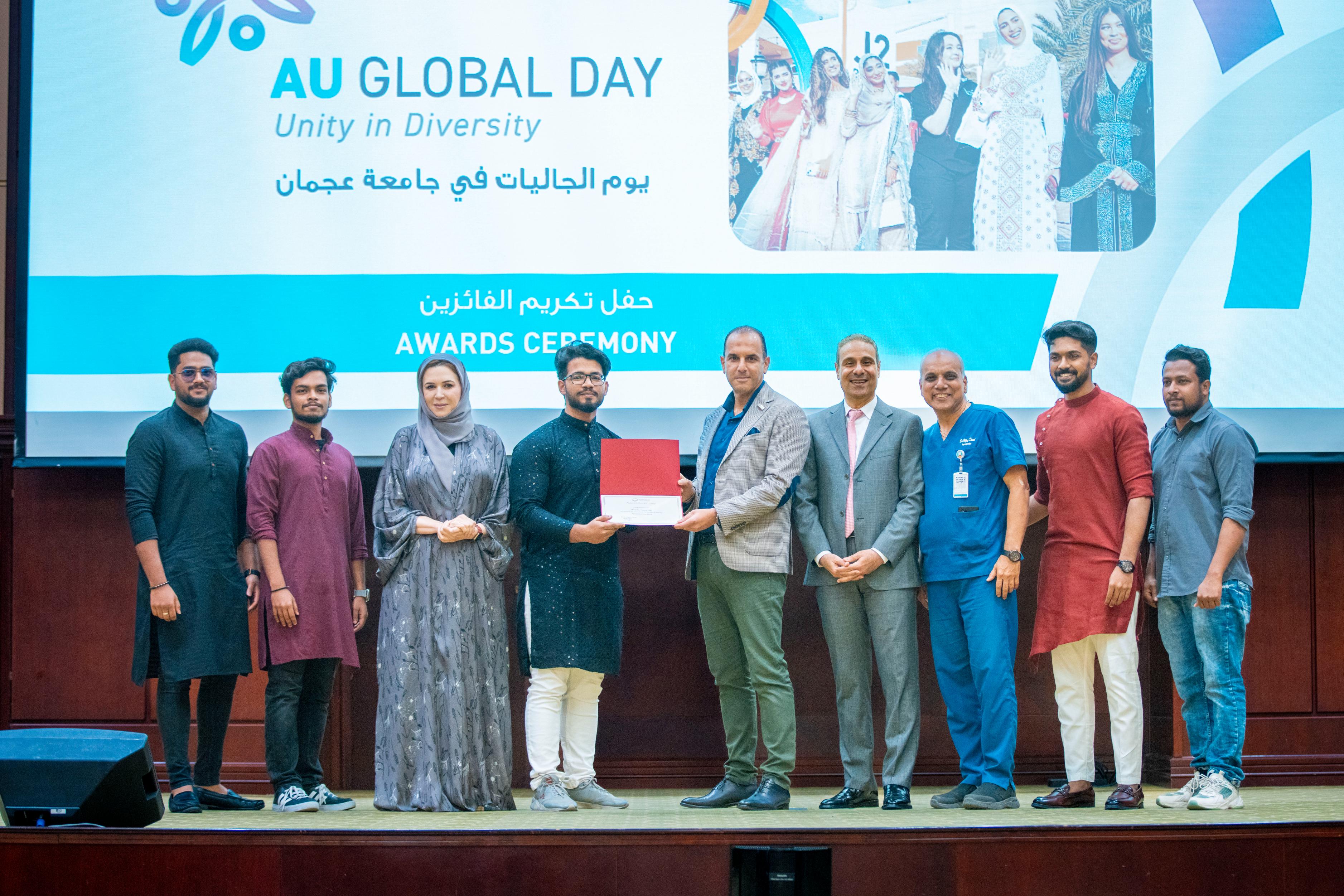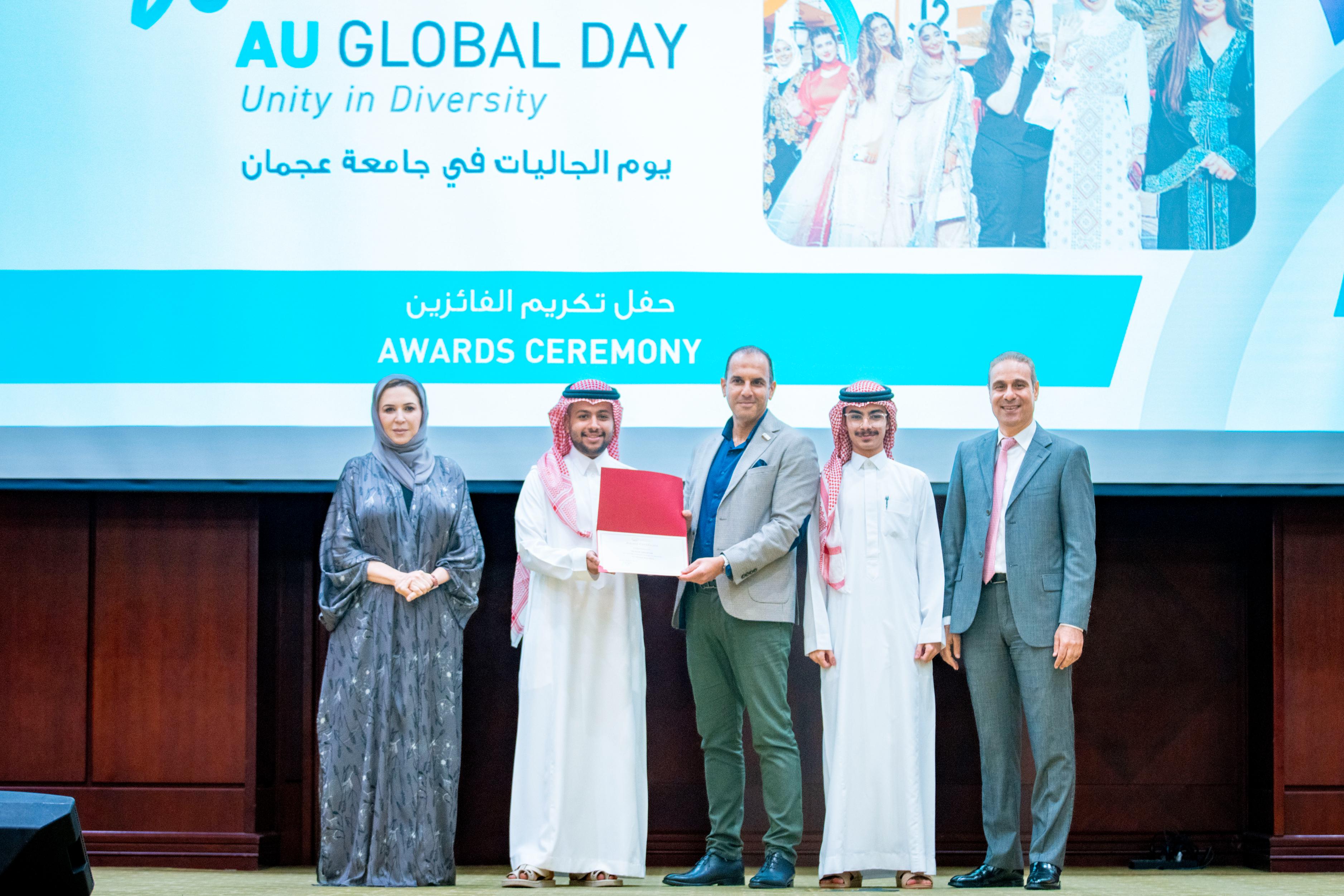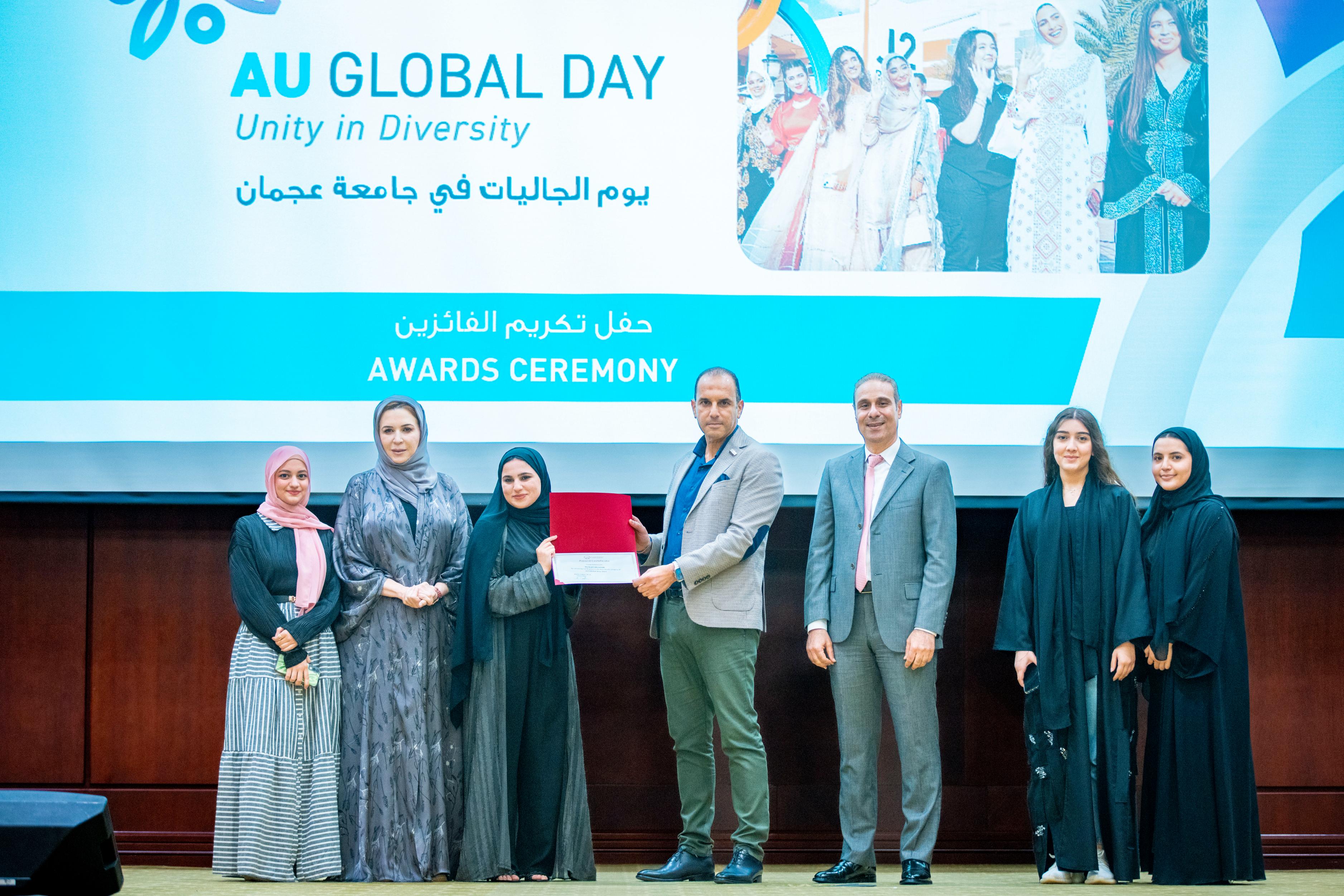 The Office of Student Life at Ajman University organized an event to honor the winning clubs on AU Global Day 2024 across various categories. Dr. Karim Seghir, Chancellor of Ajman University, honored the winning clubs in the presence of Dr. Nahla Al Qassimi, Dean of Student Services, and Dr. Mohamed Helal, Director of Student Life.