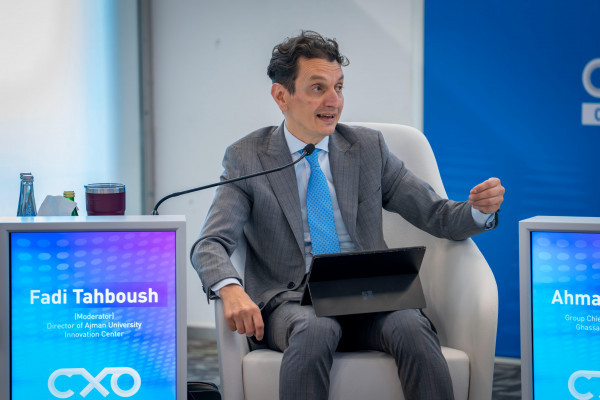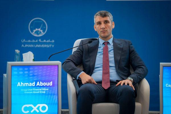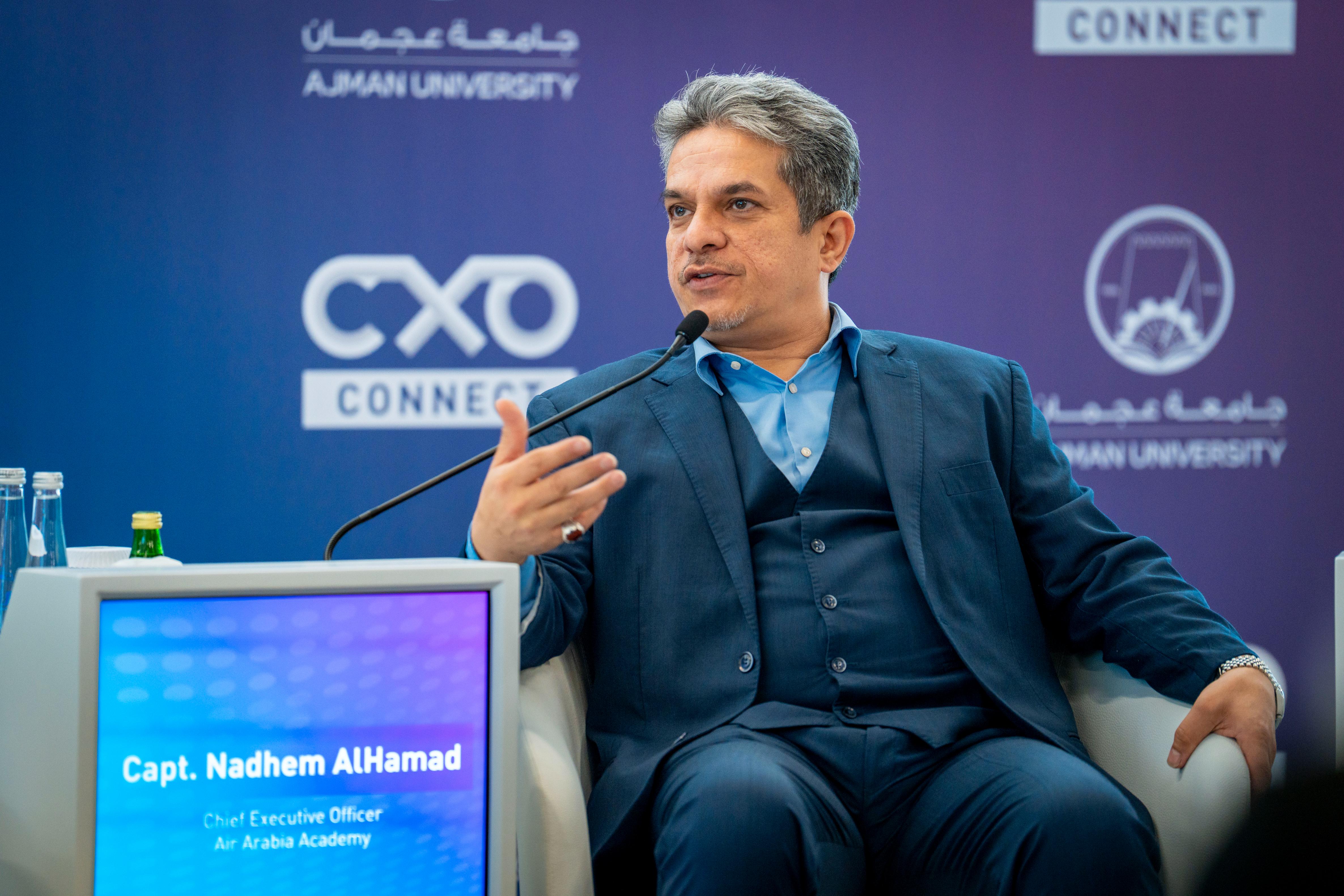 The distinguished panel featured Mr. Ahmed Aboud, CEO of Ghassan Aboud Group; Capt. Nadhem Alhamad, CEO of Air Arabia Academy; and Mr. Maher Al Kaabi, Advisor to Group Chairman and Independent Board Member, Alserkal Group of Companies. The session was skillfully moderated by Mr. Fadi Tahboush, Director, Ajman University Innovation Center.
