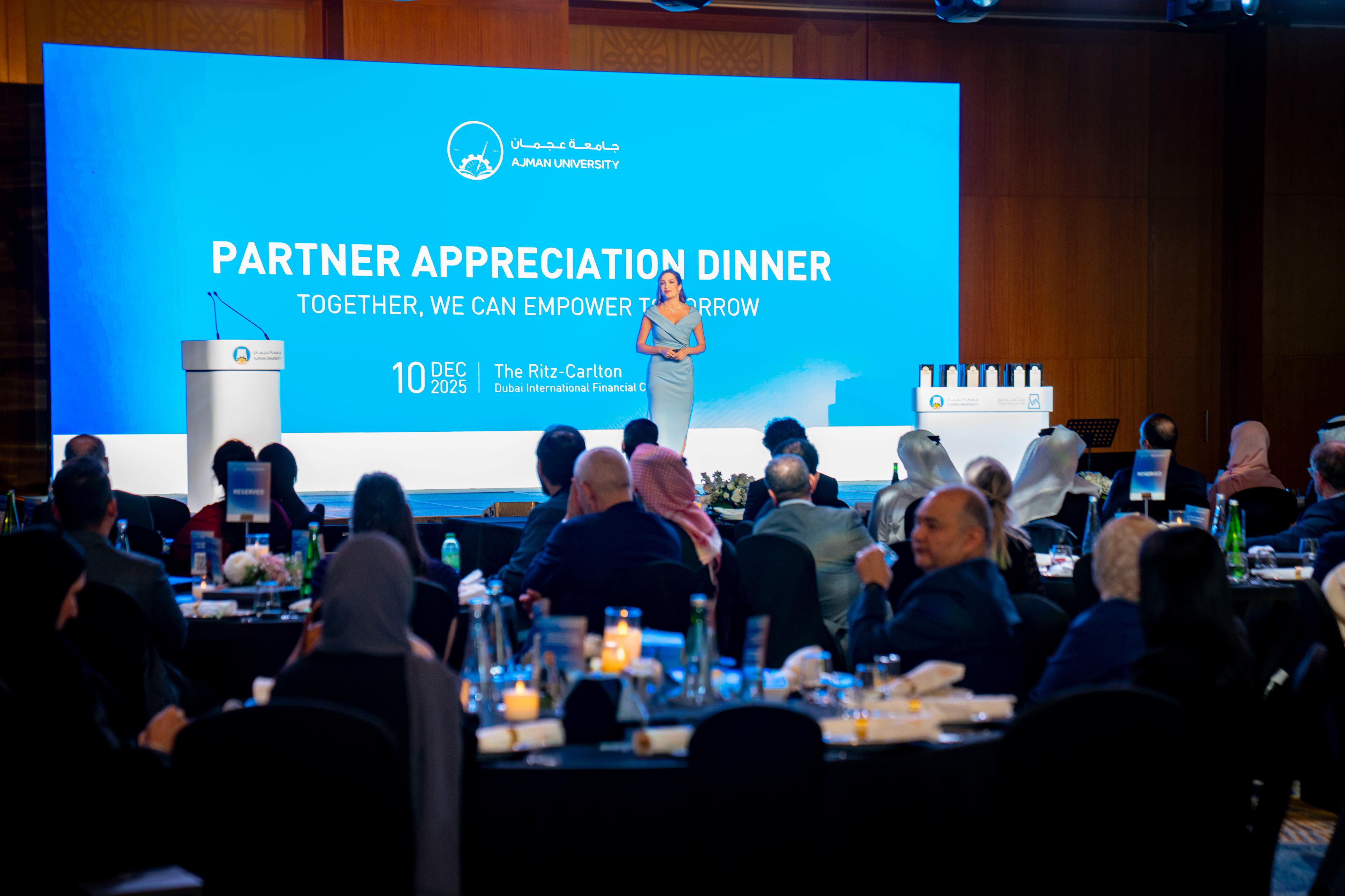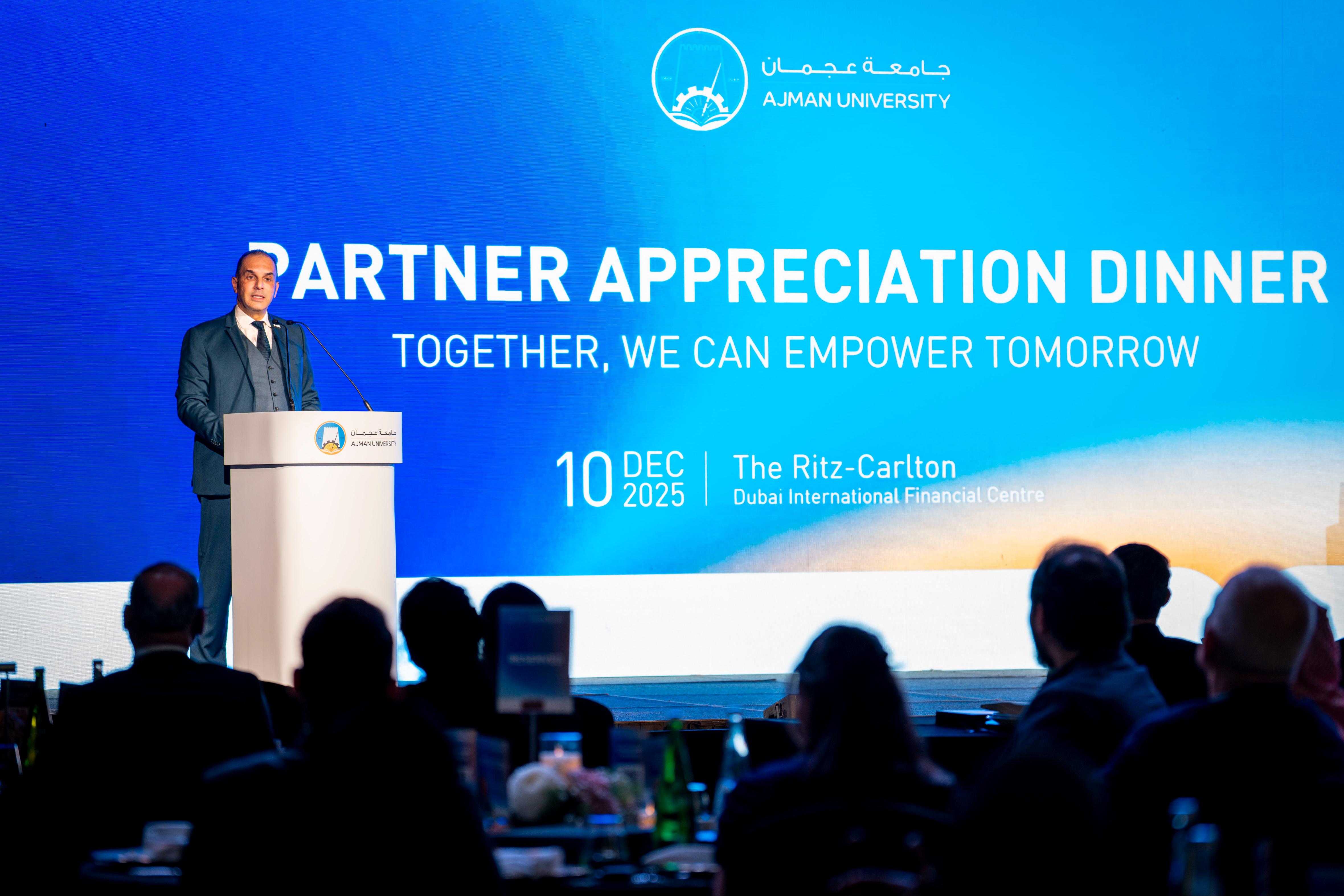 Ajman University hosted its first Partner Appreciation Dinner at The Ritz-Carlton Hotel in Dubai, convening representatives from leading government entities, private-sector organizations, financial institutions, business groups, educational partners, and healthcare providers from across the UAE. Held under the theme “Together, We Can Empower Tomorrow,” the event reflected the University’s commitment to strategic cooperation that strengthens students’ transition from academic study to meaningful careers.
