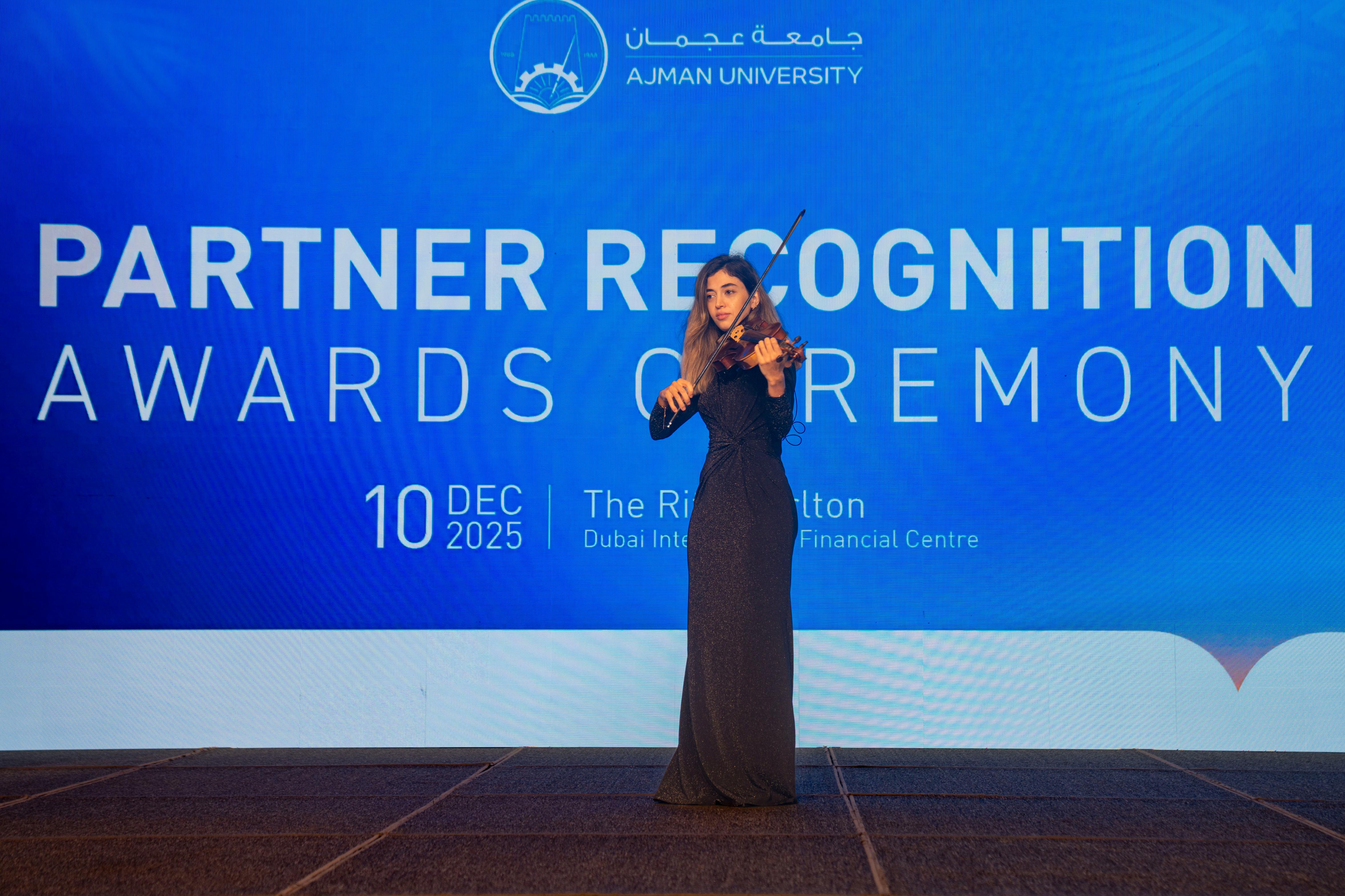 As part of the evening’s proceedings, Ajman University presented recognition trophies to distinguished partners whose contributions have played a significant role in advancing the professional preparation of AU students. Those honored included Ajman Bank, Ajman Chamber, Ajman Municipality and Planning Department, Al Tamimi & Company, Amazon Web Services (AWS), Arab Bank, Arada Developments, AW Rostamani, Burjeel Holding, Clinica Medical Center, Concord Stars Contracting, the Department of Finance – Government of Ajman, Dubai Police, e&, Emirates Flight Catering, Huawei, Leader Healthcare Group, Majid Al Futtaim, Ramada Hotel, Richemont, Ru’ya Bank, and Saudi German Hospital.