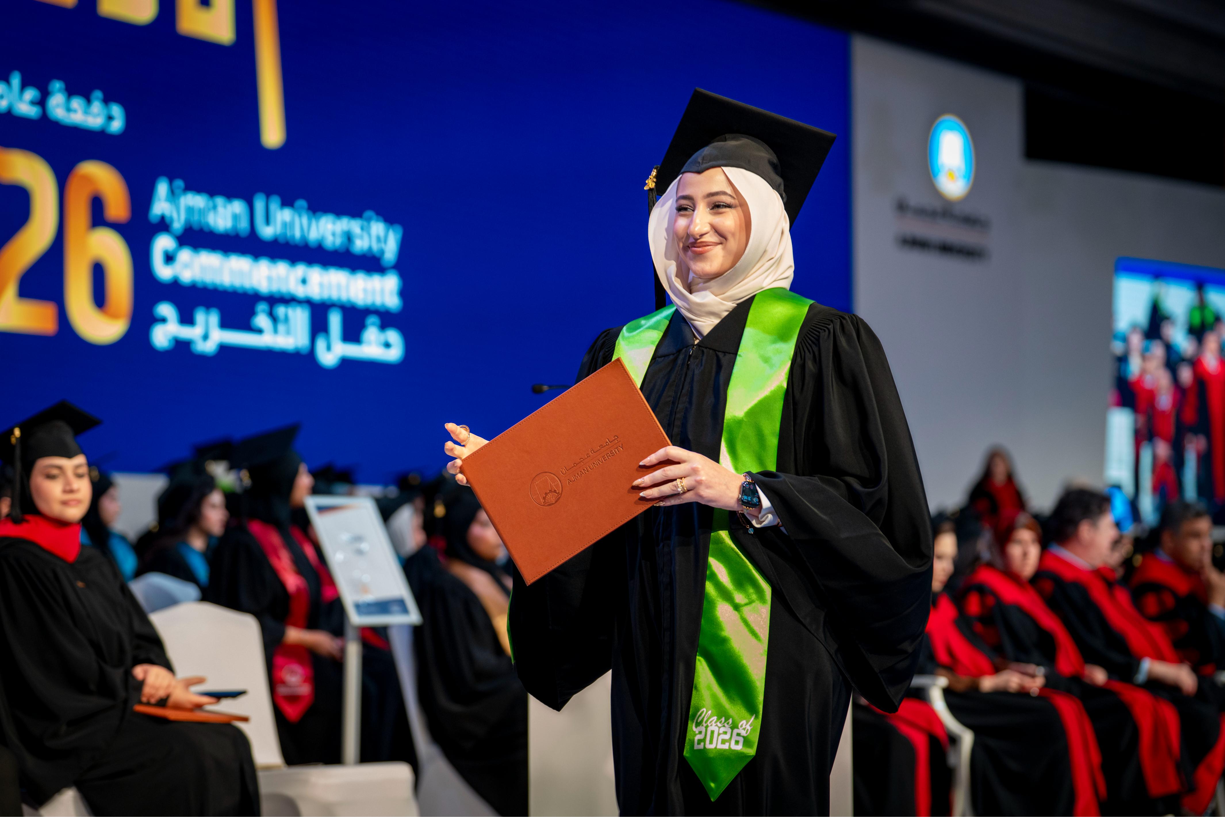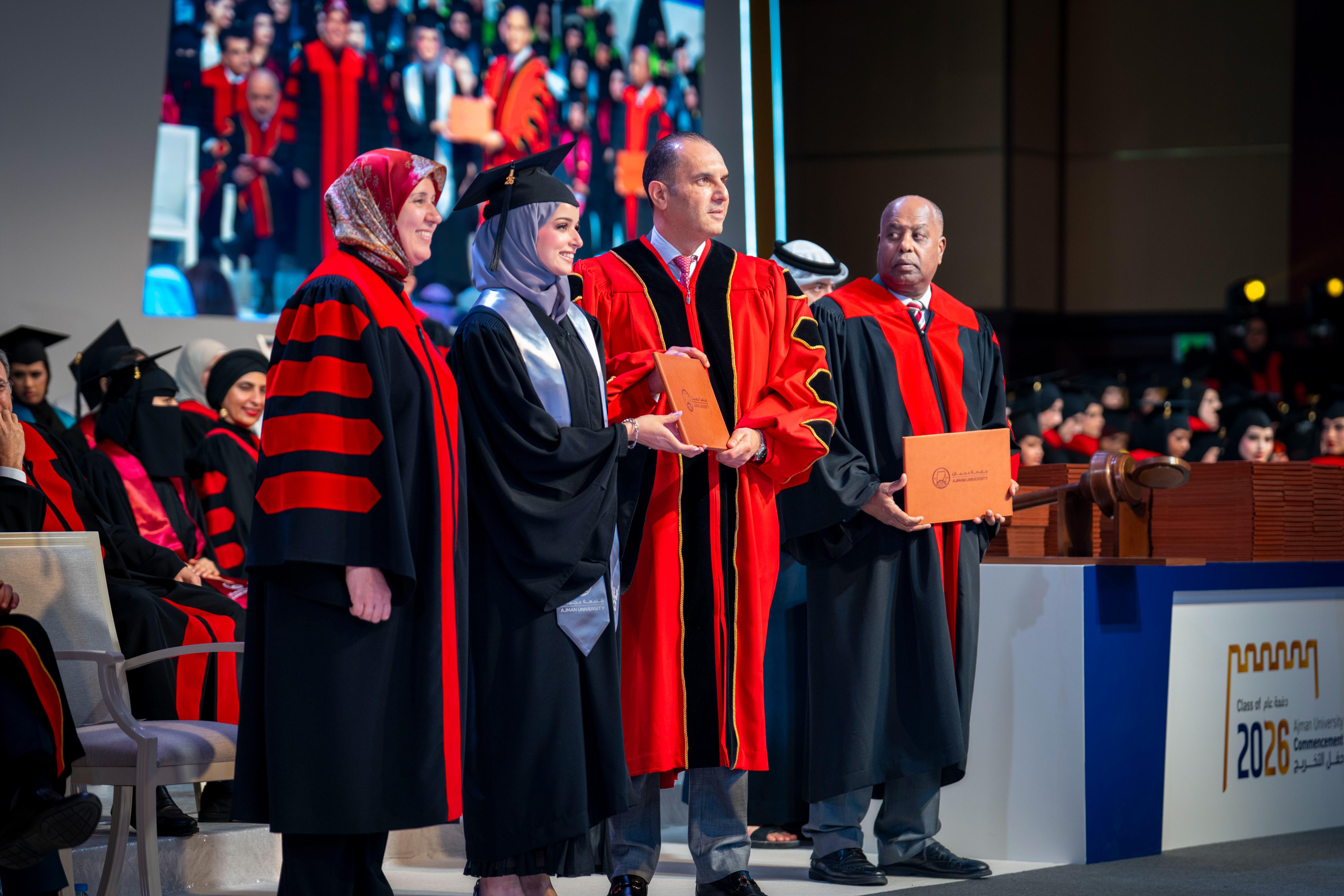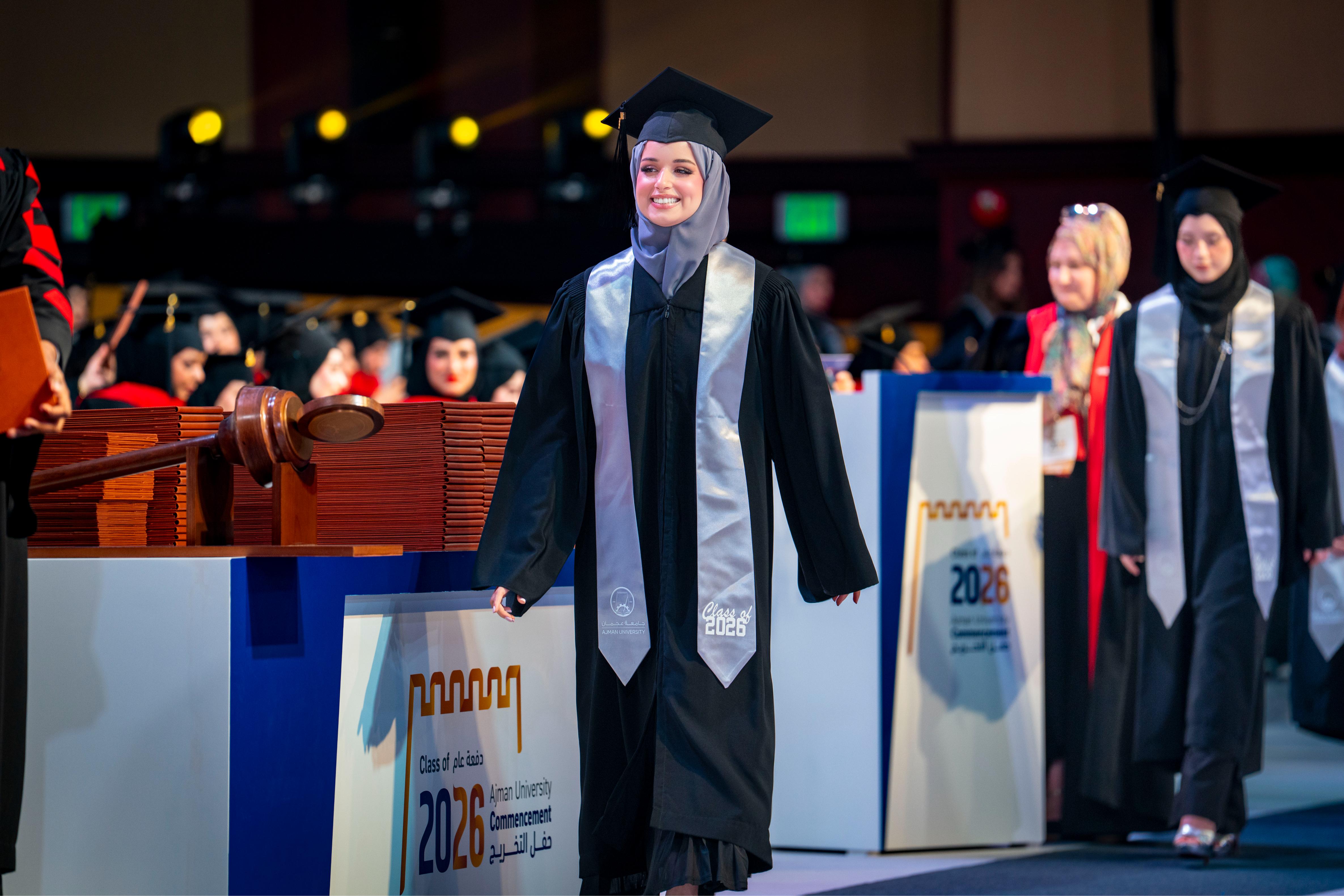 Graduate Ghaid Obaid Salem Saeed Al Nuaimi delivered the graduates’ speech, expressing her thanks and appreciation to Sheikha Fatima bint Zayed bin Saqr Al Nahyan for honouring the ceremony and her generous patronage of the thirty-fifth graduation ceremony for the first cohort “UAE-Kuwait Brotherhood Class of 2026”. She also praised the support provided by faculty members during the years of study, and the stimulating academic environment provided by Ajman University, which contributed to developing the graduates’ skills and qualifying them to confidently embark on their professional future.