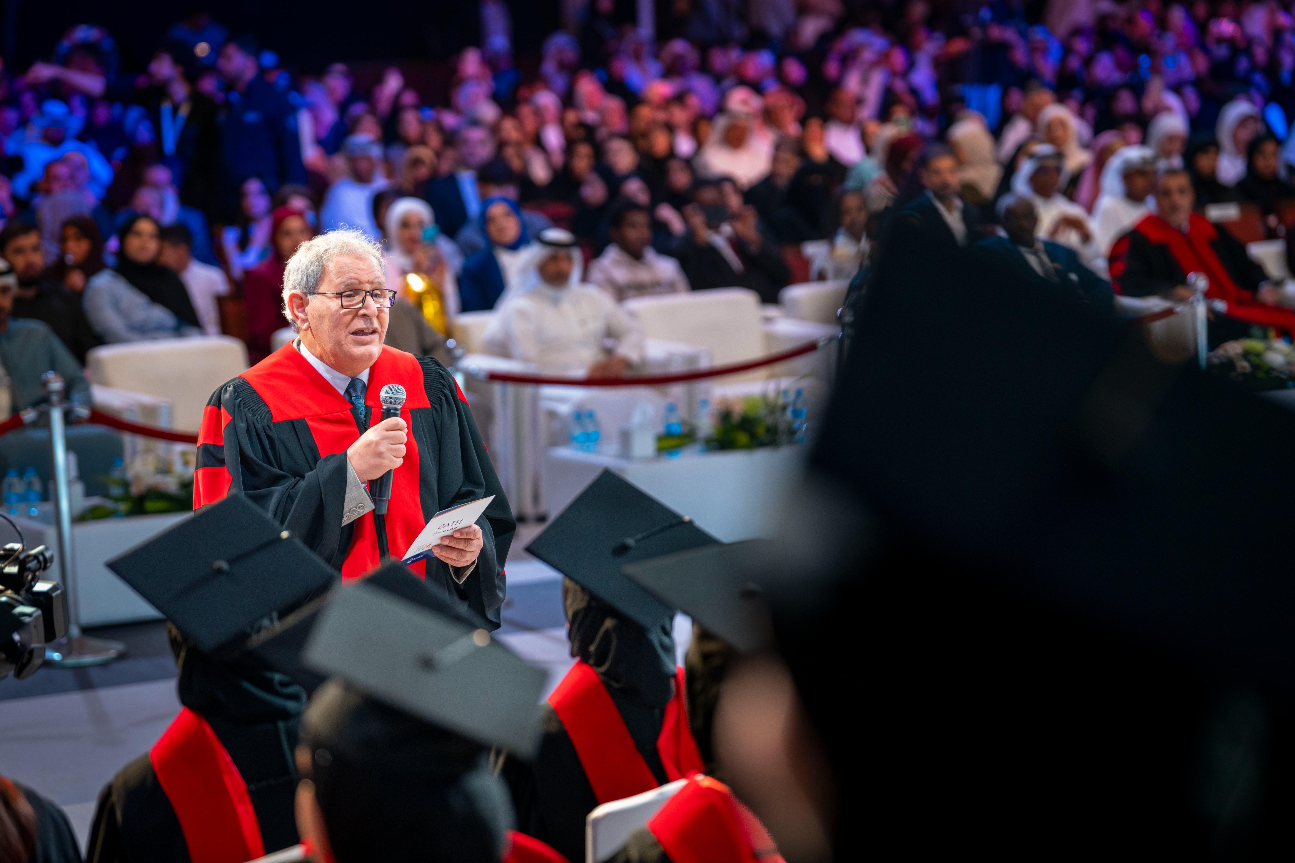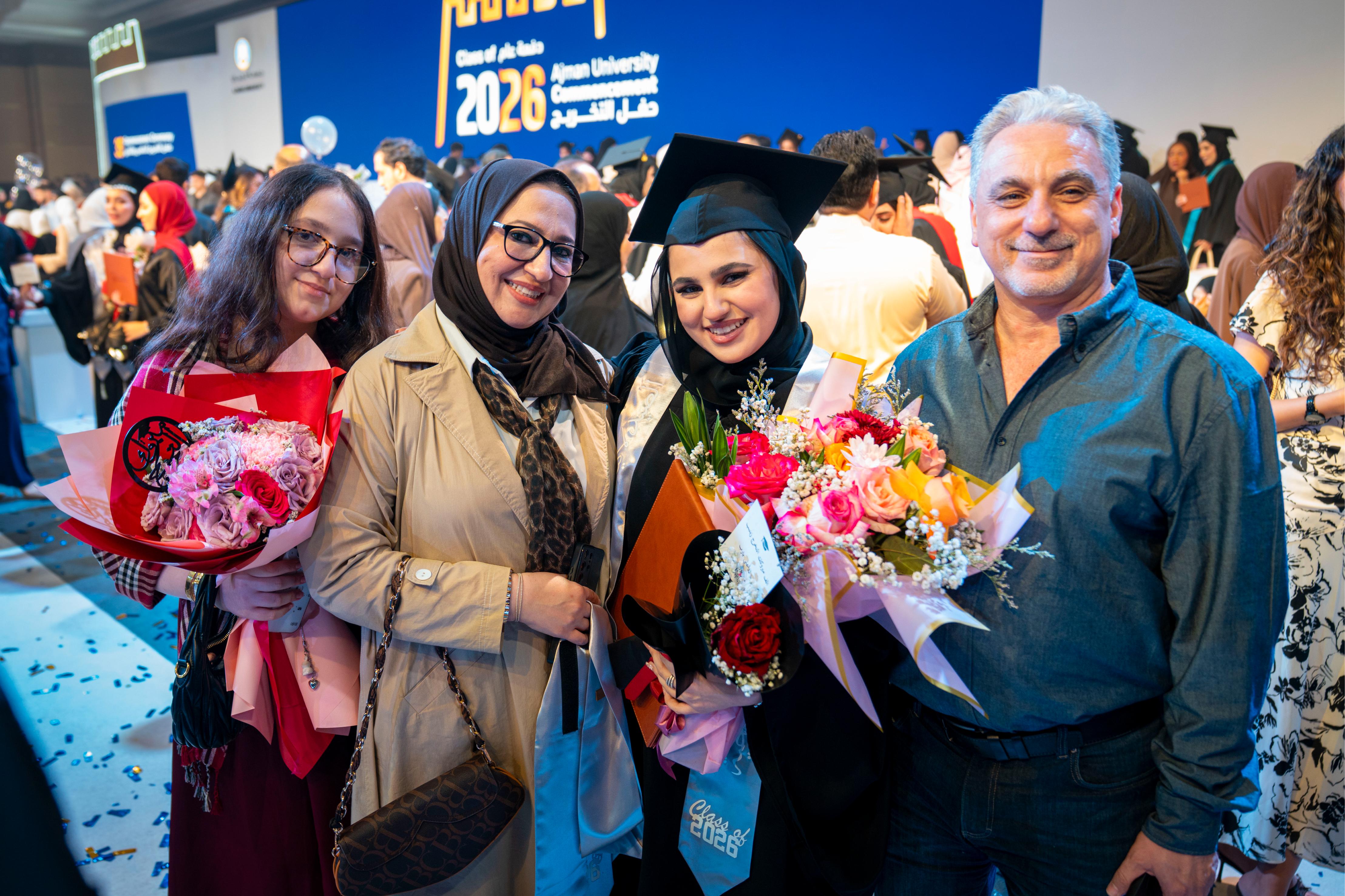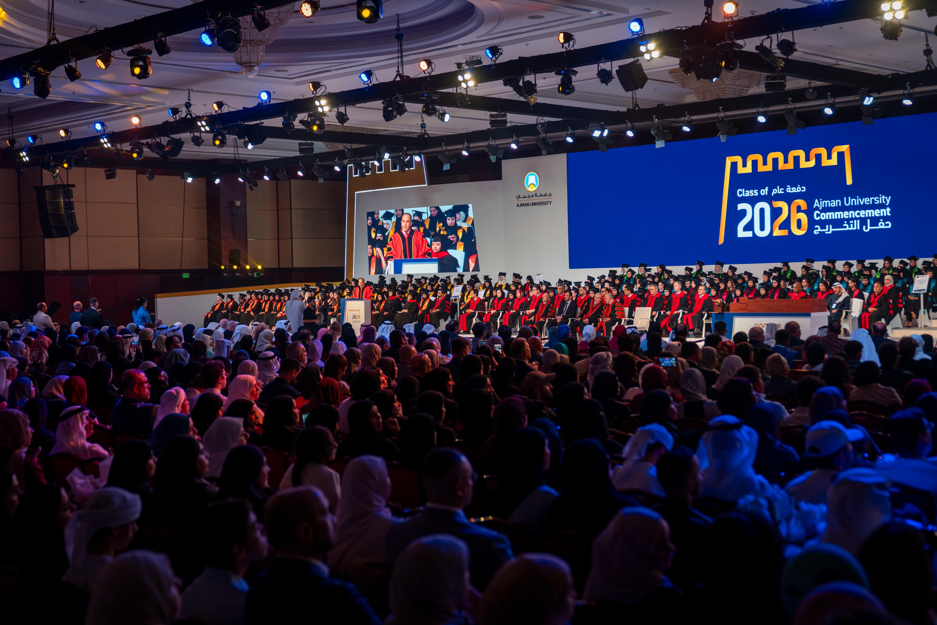 Graduate Ghaid Obaid Salem Saeed Al Nuaimi delivered the graduates’ speech, expressing her thanks and appreciation to Sheikha Fatima bint Zayed bin Saqr Al Nahyan for honouring the ceremony and her generous patronage of the thirty-fifth graduation ceremony for the first cohort “UAE-Kuwait Brotherhood Class of 2026”. She also praised the support provided by faculty members during the years of study, and the stimulating academic environment provided by Ajman University, which contributed to developing the graduates’ skills and qualifying them to confidently embark on their professional future.