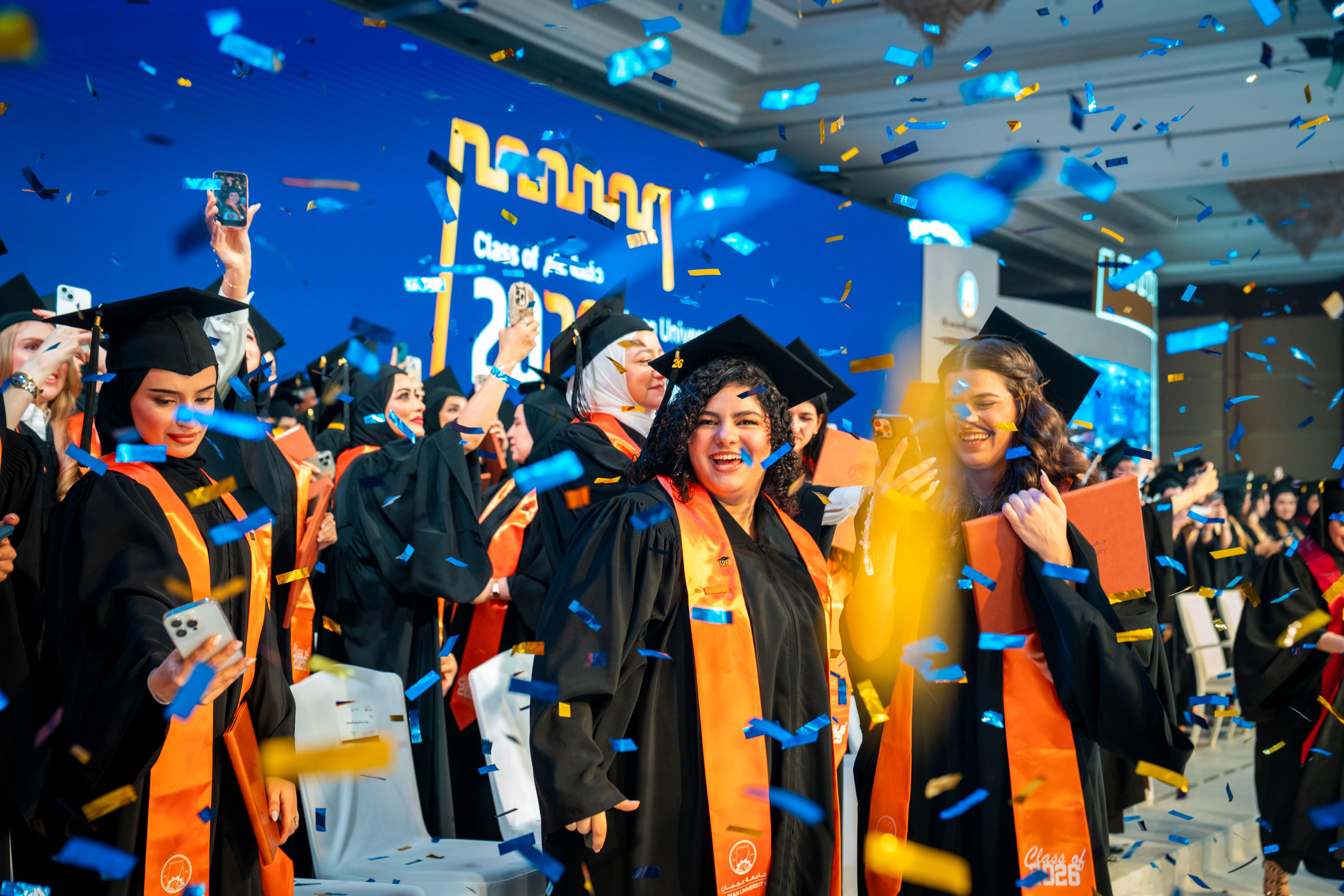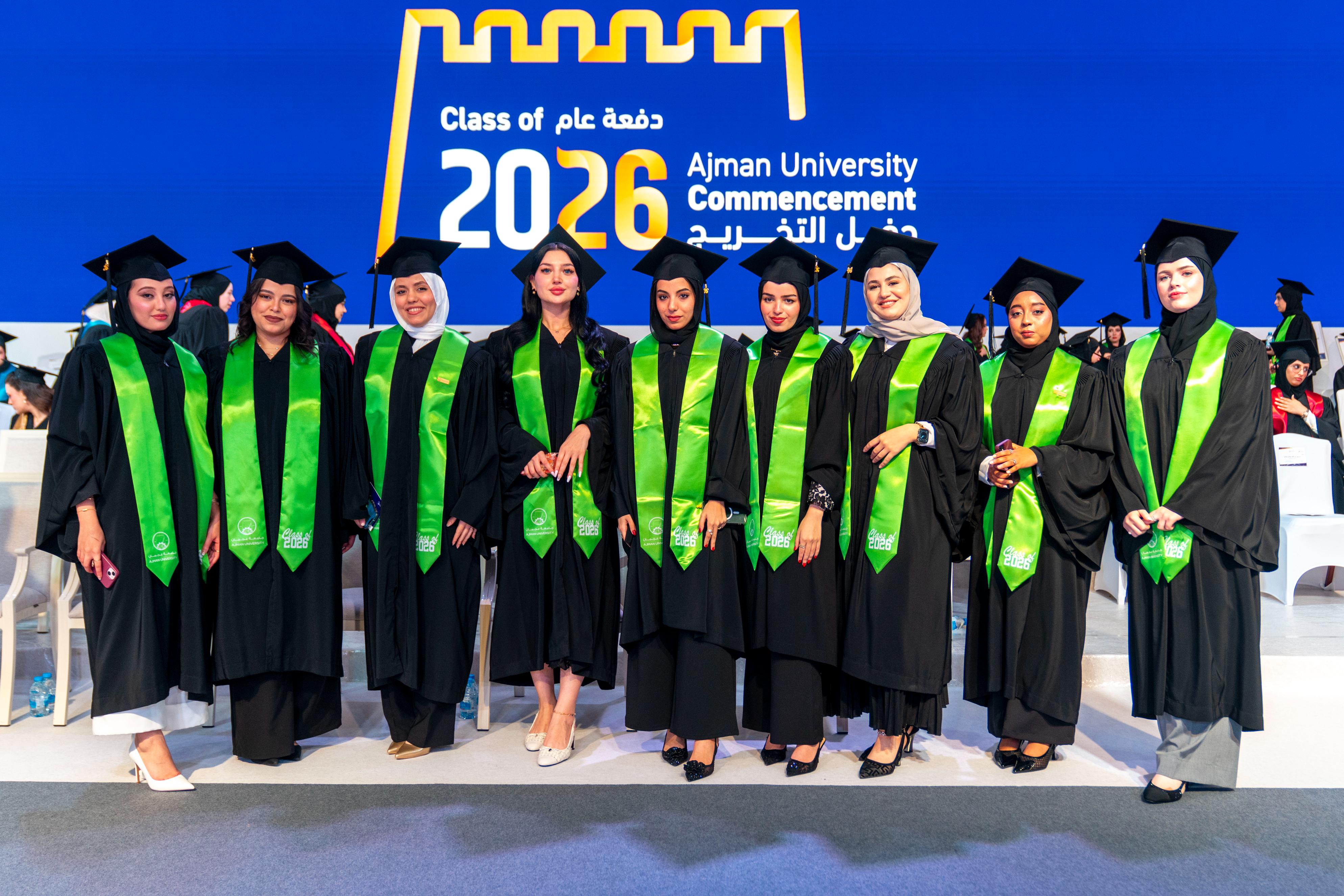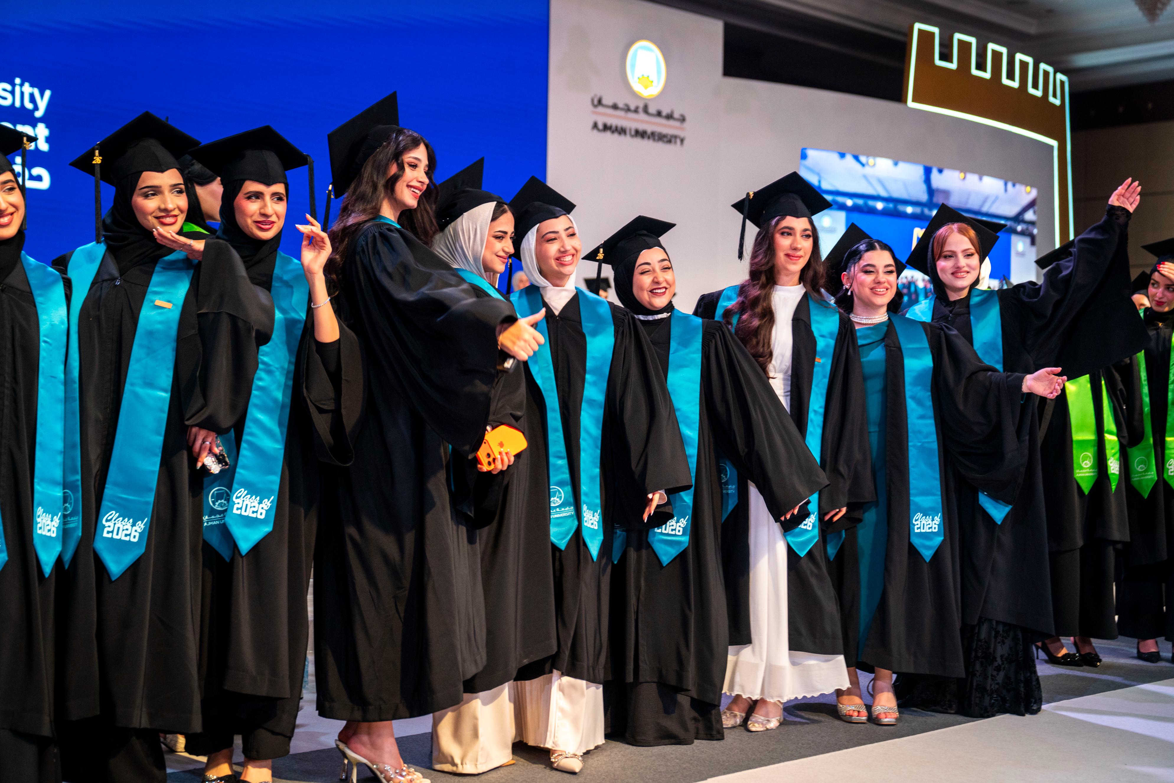 The consort of His Highness Sheikh Humaid bin Rashid Al Nuaimi, Member of the Supreme Council and Ruler of Ajman, Sheikha Fatima bint Zayed bin Saqr Al Nahyan, Chairwoman of Umm Al Mu’mineen Association and Chairwoman of the Board of Trustees of the Rashid bin Humaid Award for Culture and Science, witnessed the thirty-fifth graduation ceremony for female students of Ajman University, which was dedicated to graduating the first cohort “UAE-Kuwait Brotherhood Class of 2026”, comprising over 450 graduates holding bachelor’s degrees and postgraduate qualifications.