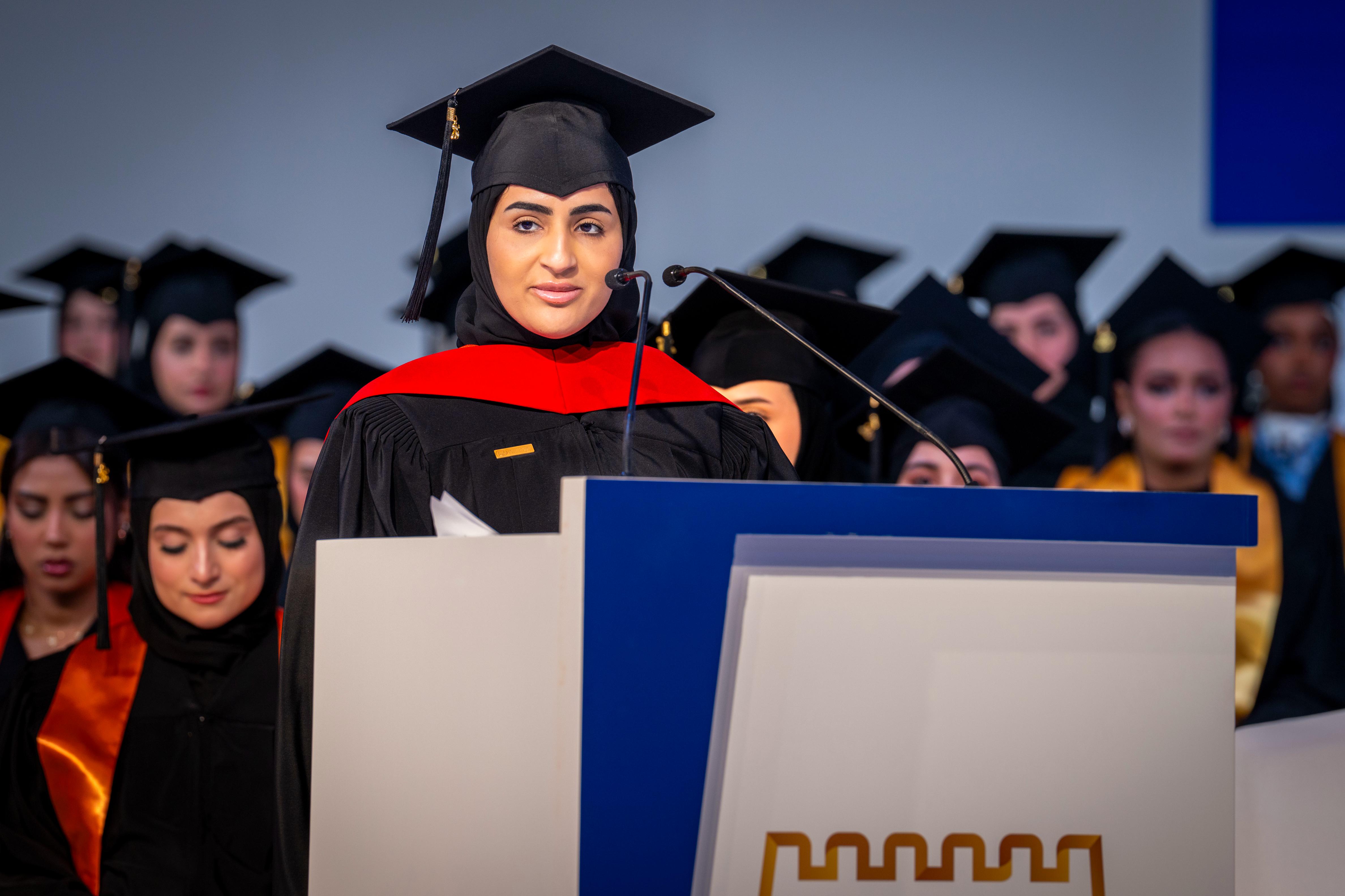 For her part, Dr Nahla Al Qasimi, Dean of Student Affairs at Ajman University, delivered the University’s speech, expressing sincere thanks and gratitude to Sheikha Fatima bint Zayed bin Saqr Al Nahyan for her continued support of the University, her constant patronage of knowledge, learning and youth, and her commitment to consolidating the spirit of positivity and ambition among students. She also valued the efforts of the teaching and administrative staff in accompanying, supporting and motivating students throughout their educational journey.