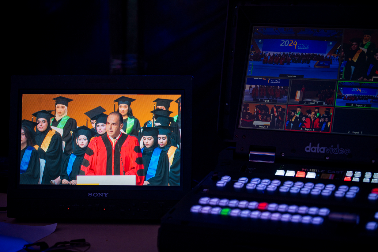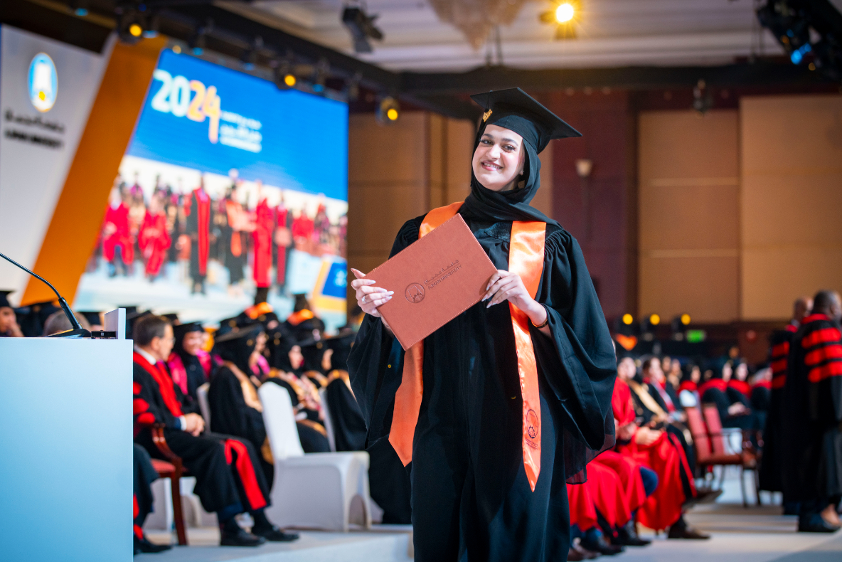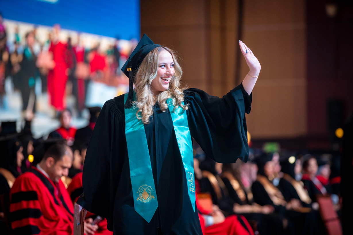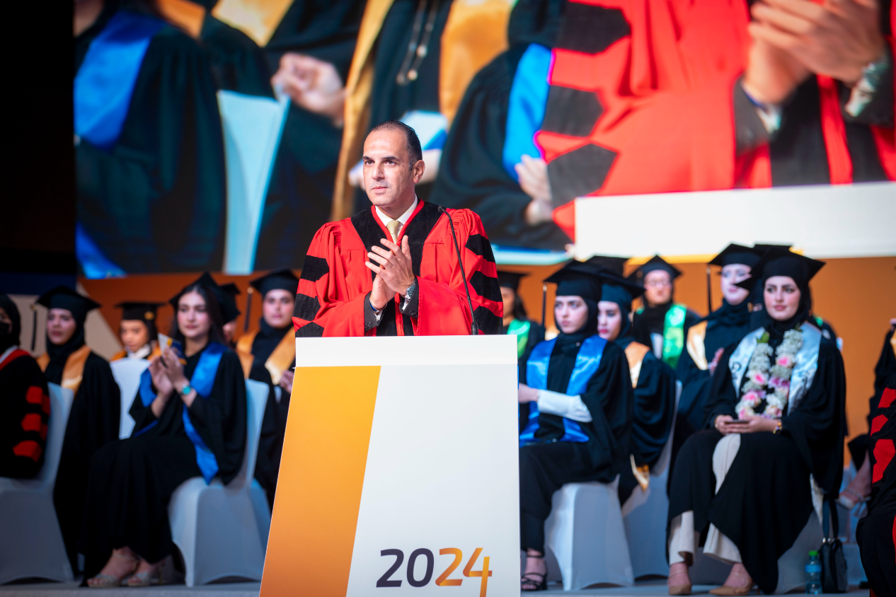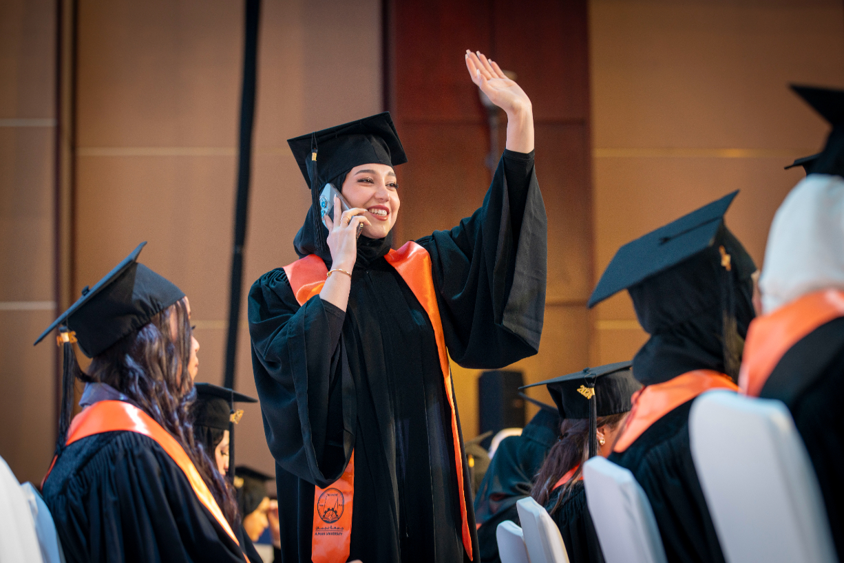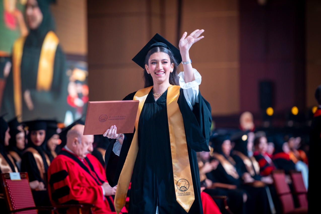 The graduation ceremony commenced with the arrival of H.H., the Ruler of Ajman, and his entourage to the ceremony hall. The national anthem was played, followed by the recitation of verses from the Holy Quran. Subsequently, a video highlighting the university's mission and achievements. H.H., the Ruler of Ajman, commended the remarkable standards of the higher education system of the UAE and the country’s cultural renaissance across various domains, especially in education and science. He attributed this success to the unwavering support from H.H. Sheikh Mohamed bin Zayed Al Nahyan, the President of the UAE, and his brother H.H. Sheikh Mohammed bin Rashid Al Maktoum, Deputy President of the State, Prime Minister, Ruler of Dubai. Their ongoing support reflects a strong belief in knowledge and education as fundamental pillars for progress and development. H.H. stated, "Higher education is a great asset that is invaluable, representing the true investment in humanity, enhancing the bright image of the United Arab Emirates, known for its developmental and educational achievements, contributing to the advancement of intellectual, scientific, economic, cultural, and social progress regionally and internationally."
