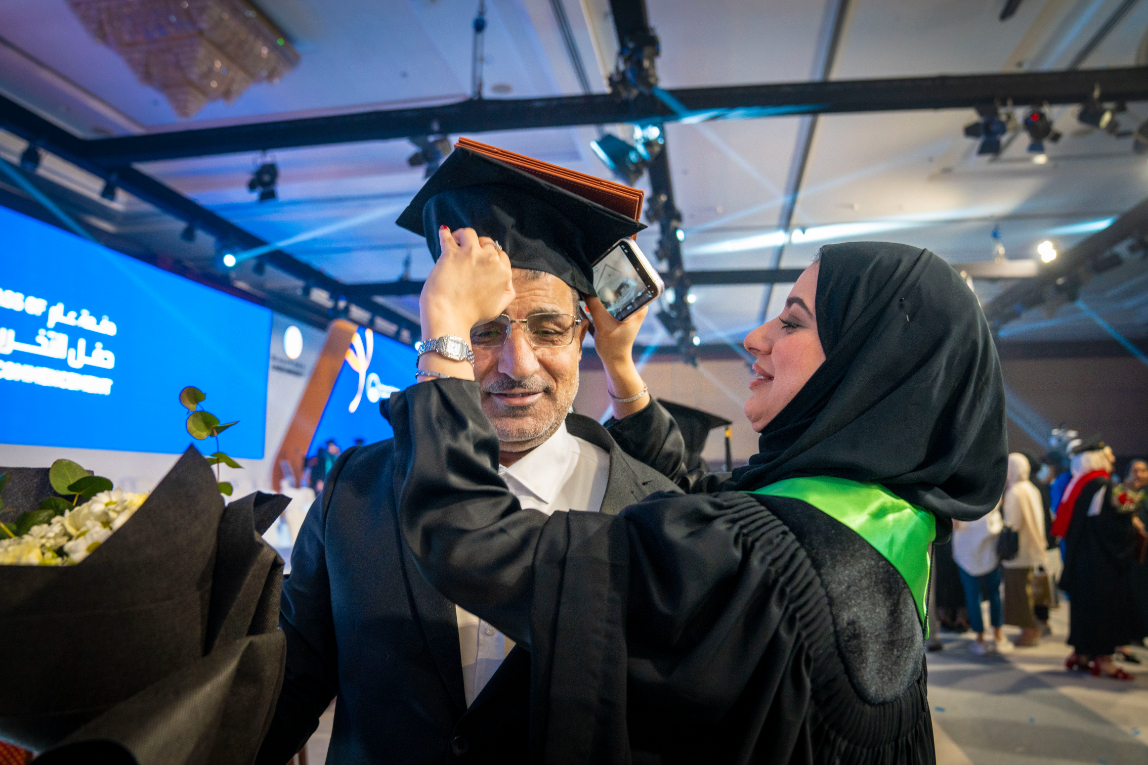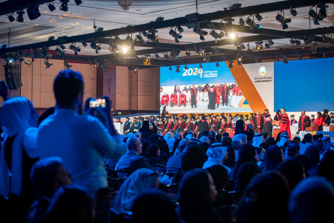 His Highness, the Ruler of Ajman, accompanied by H.H. Sheikh Ammar bin Humaid Al Nuaimi, honored the graduates of postgraduate studies and the top students of the colleges. H.H. Sheikh Ammar bin Humaid Al Nuaimi, accompanied by H.H. Sheikh Rashid bin Humaid Al Nuaimi and Dr. Karim Seghir, oversaw the certificates distribution to the graduates and the recognition of outstanding achievements among them.