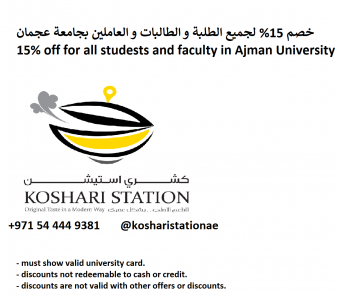 Koshari Station offers a 15% discount for all students and faculty at Ajman University.