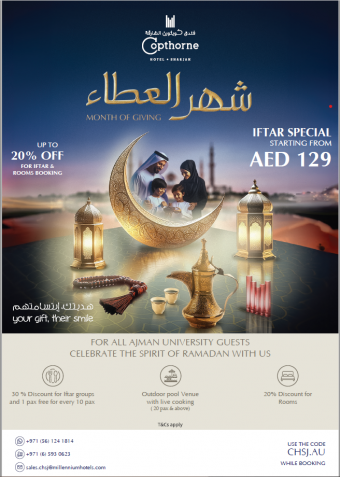 A flat 20% discount on rooms and Ramadan Iftar at Copthorne Hotel Sharjah when using the code CHSJ.AU. Additionally, for groups comprising more than 6 individuals, there is a 30% discount on Iftar using the same code.