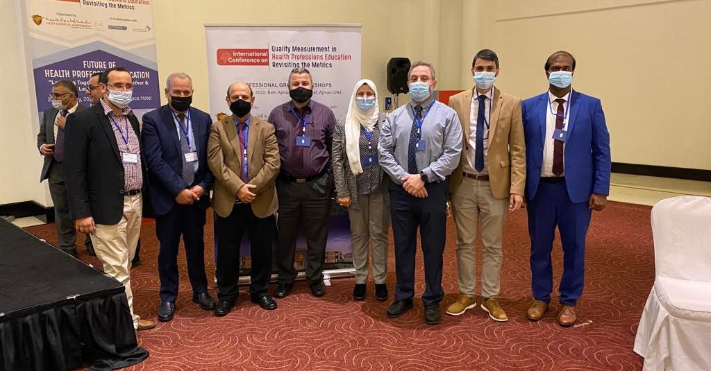 Five members of the College including Prof. Nageeb Hassan (Dean), Dr. Moawia Altabakha (Head of the Pharmaceutical Sciences Department), Dr. Muaed Al Omar (Head of the Clinical Sciences Department), Dr. Subish Palaian (Coordinator of Experiential Education) and Dr. Sanah Hasan (Clinical Sciences Faculty) have participated in the “Quality Measurement in Health Professions Education – Revisiting the Metrics” conference organized by Gulf Medical University (GMU). The conference was conducted over three days (February 25-27 February). On the first day, a series of workshops were conducted online under the theme: “how to design assessments for learning programmatically.” On the second day, a virtual conference consisting of webinars delivered by renowned academics and researchers in the assessment world. On the third day, an all-day workshop titled: “What does assessment of personal and professional development look like?” on competency assessment in pharmacy education. Evidence-based methods to assess personal and professional development as expected in the UAE Professional Pharmacy Graduates Competency Framework was reviewed. Discussions were shared by faculty from all pharmacy colleges in the UAE to learn about implementing the competency framework devised by the Ministry.