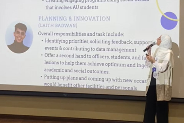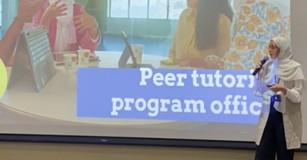Peer Tutor students representing the Student Success Center (SSC) at Ajman University (AU) delivered a well-attended presentation on ‘Pharmacy Students’ Professional Activities’ at GMU Pharmacy Students’ Congress Workshop conducted on Saturday, 4th Feb 2023. First Year Pharmacy student Hana Mohamed, Peer Tutor and Training Coordinator with the SSC, highlighted the mission of the Center and its strategies in helping student’s reach their full academic potential through providing student-tailored and individualized tutoring under the Peer Tutoring and the Academic Twinning programs. She also described the different activities organized by the College of Pharmacy, like the Breast cancer awareness, Diabetes Awareness campaign, and their achievements during the resent DUPHAT conference in Dubai.