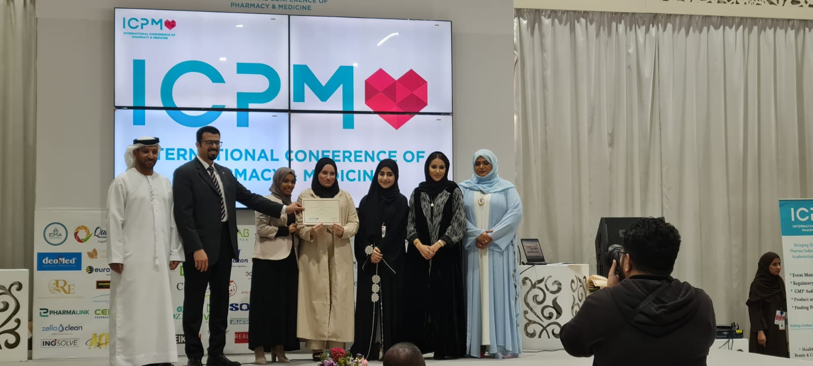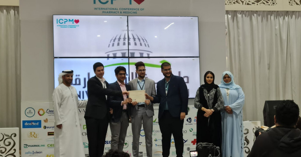 Students Hamas Adel, Yara Alyahia and Adeeb Younes Adeeb were awarded the fourth-Best Innovative Pharmacy Student Poster Award at ICPM under the "innovative" category for presenting a poster titled “Comparative stability study of various painkillers marketed in the UAE.” Students were supervised by Dr. Akram Ashames and Co-Supervised by Mr. Taimoor Ahmad and Mr. Sohaib Khan.
