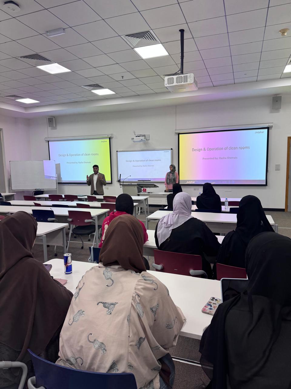 Ajman University’s College of Pharmacy and Health Sciences (COPHS) successfully hosted an enriching guest lecture titled “Pharmaceutical Clean Room Design and Operations,” delivered by esteemed industry expert Dr. Rasha Ahmed. The session brought together third-year pharmacy students for an in-depth exploration of contemporary contamination-control practices essential to advanced pharmaceutical manufacturing and research environments. This initiative supports COPHS’s ongoing strategy of strengthening academia–industry collaboration through courses co-delivered with leading organizations such as Julphar.