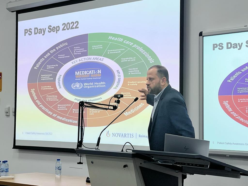 Dr. Nihal Ibrahim, the Head of the Events Committee of the College of Pharmacy and Health Sciences, welcomed the delegates from Novartis (Drs. Mohamed Ramadan, Ahmed Salah, Maria Abdou, and Wesam Dawwas) and introduced them to the audience. During the event, Dr. Mohamed Ramadan, the POP Governance Manager, presented “Patient safety practices in Novartis” to the students and emphasized the importance of pharmacovigilance on marketed medicinal products by the company and introduced the various processes in place to ensure patient safety. He also listed the emerging scope of pharmacists in pharmacovigilance and highlighted various pharmacovigilance-related topics such as signal detection methods in pharmacovigilance and the critical role of Pharmacists in identification and reporting of Adverse Events , adverse drug reaction reporting procedures followed by Novartis, etc. During the presentation, Dr. Ramadan also introduced ‘Adverse Events with medical devices’ which is one of the most common un-identified Adverse Events.