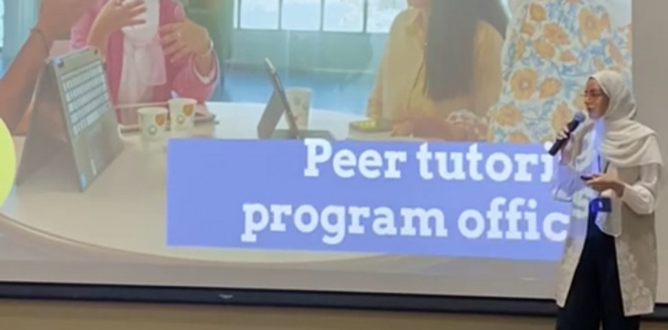 Peer Tutor students representing the Student Success Center (SSC) at Ajman University (AU) delivered a well-attended presentation on ‘Pharmacy Students’ Professional Activities’ at GMU Pharmacy Students’ Congress Workshop conducted on Saturday, 4th Feb 2023. First Year Pharmacy student Hana Mohamed, Peer Tutor and Training Coordinator with the SSC, highlighted the mission of the Center and its strategies in helping student’s reach their full academic potential through providing student-tailored and individualized tutoring under the Peer Tutoring and the Academic Twinning programs. She also described the different activities organized by the College of Pharmacy, like the Breast cancer awareness, Diabetes Awareness campaign, and their achievements during the resent DUPHAT conference in Dubai.