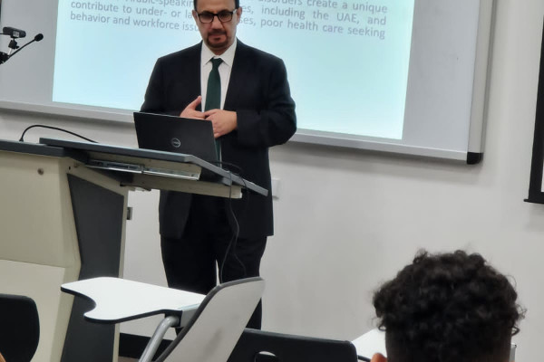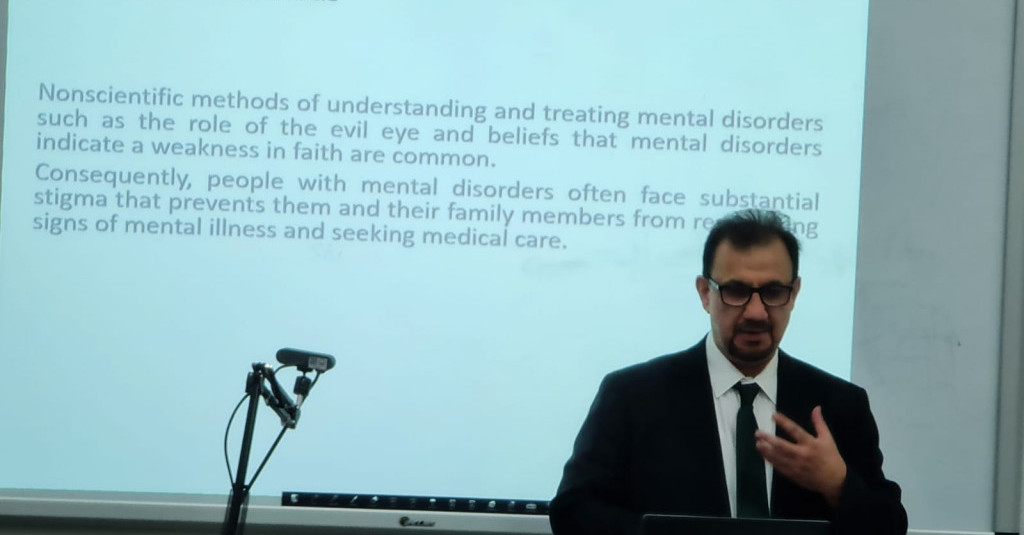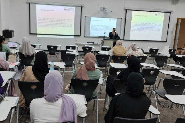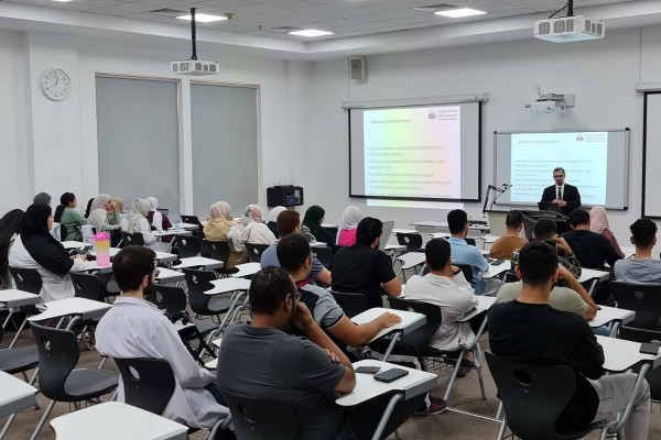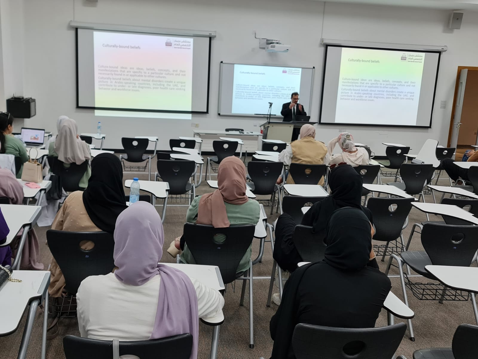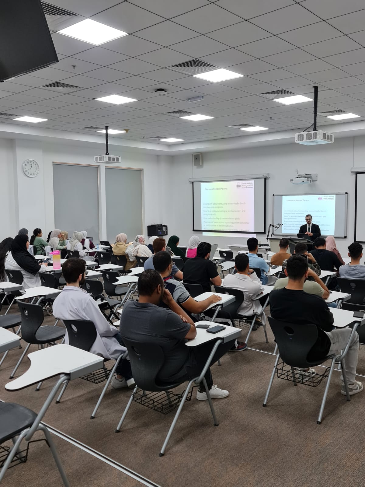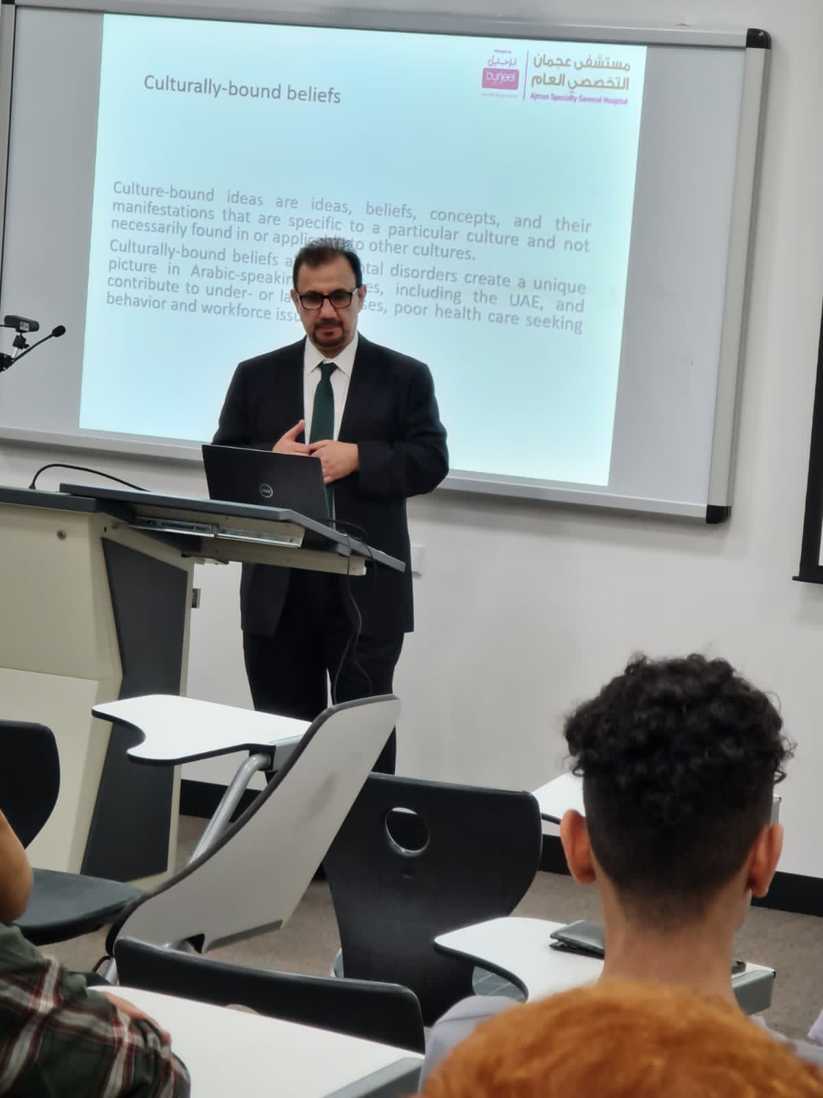 On 19th October 2023, the College of Pharmacy and Health Sciences organized a seminar on “Dealing with mentally ill patients: a focus on patient counseling by pharmacists” in partnership with Ajman Specialty General Hospital, one of the esteemed experiential education partners of Ajman University. Dr. Khalil Ibrahim, a consultant Psychiatrist at Ajman Specialty General Hospital, was the keynote speaker. The seminar was coordinated by Dr. Alaa Farajallah, a team member of the Office of Experiential Learning at the College. During his seminar, Dr. Khalil addressed the pharmacy students at was marked by a deep emphasis on the pivotal role pharmacists hold in the support and care of patients with psychiatric conditions. He urged the attending students to recognize the significance of empathy, active listening, and comprehensive counseling in their future roles as pharmacists. The session was enriched by practical examples and case studies, offering a real-world perspective on the challenges and opportunities present in mental health care within the pharmacy setting. The session included students asking questions to the resource person. Dr. Alaa thanked the resource person for his valuable information and reiterated the College’s commitment to promoting institution-training site collaboration.