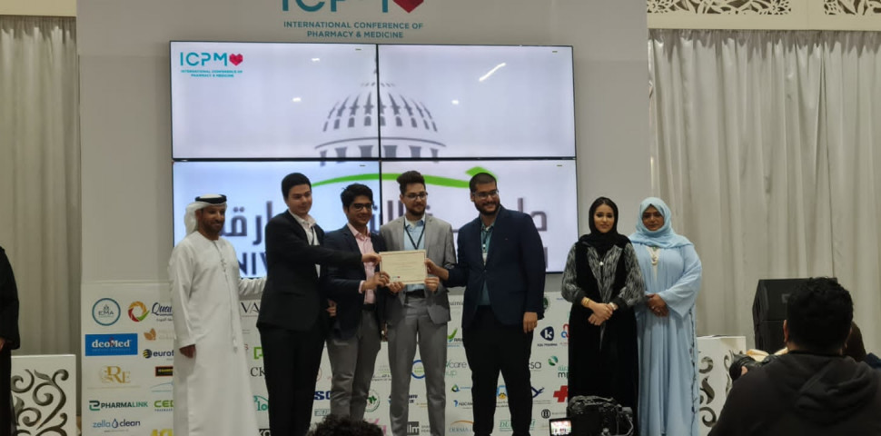 Students Hamas Adel, Yara Alyahia and Adeeb Younes Adeeb were awarded the fourth-Best Innovative Pharmacy Student Poster Award at ICPM under the "innovative" category for presenting a poster titled “Comparative stability study of various painkillers marketed in the UAE.” Students were supervised by Dr. Akram Ashames and Co-Supervised by Mr. Taimoor Ahmad and Mr. Sohaib Khan.
