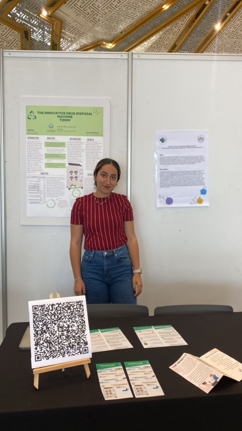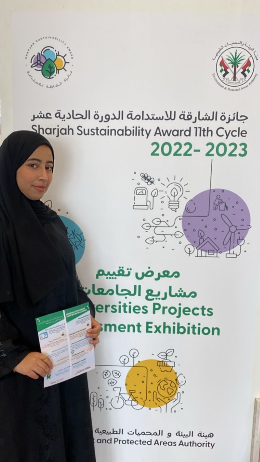 The students chose the domain of “Human and Environmental Health Protection”, where they designed a new smart drug disposal technique with the help of the Ajman University Innovation Center. This smart technique does not harm the environment and also protects the health of the community. Simply dispensing unwanted medical waste through this smart and innovative machine for proper disposal to avoid environmental health hazards.