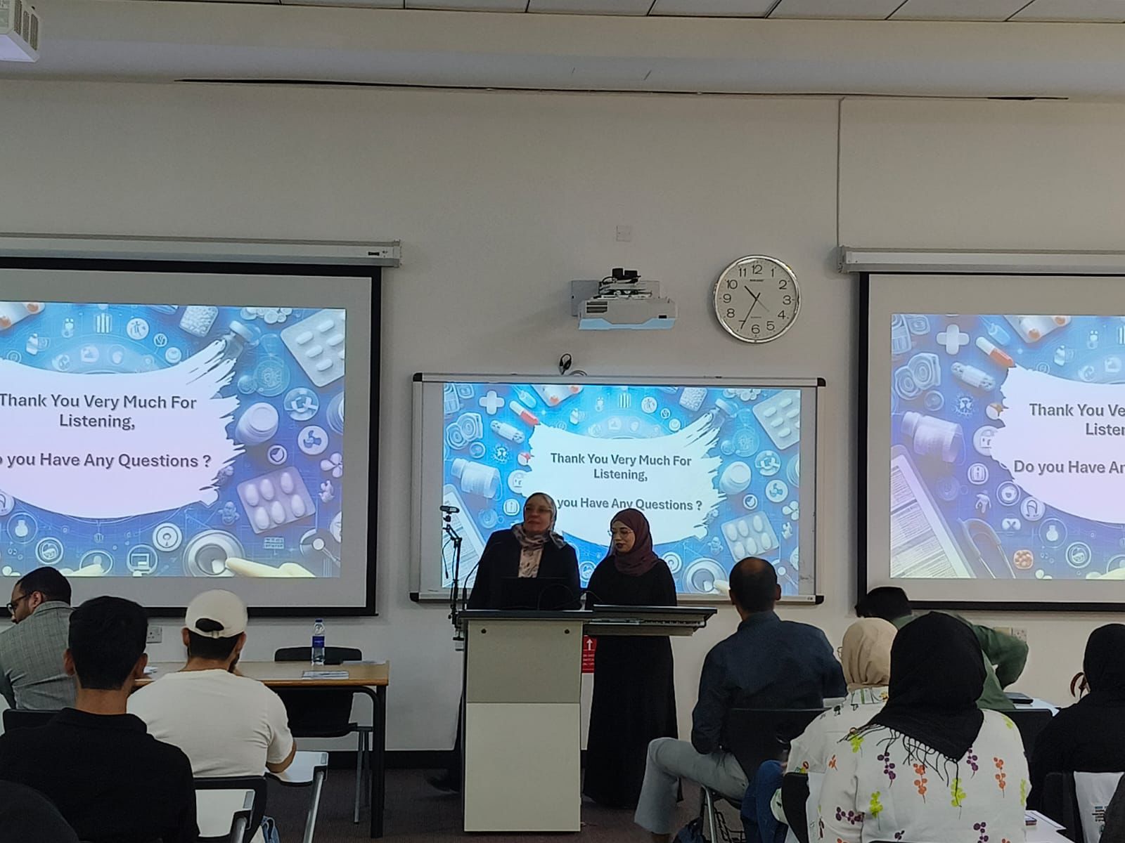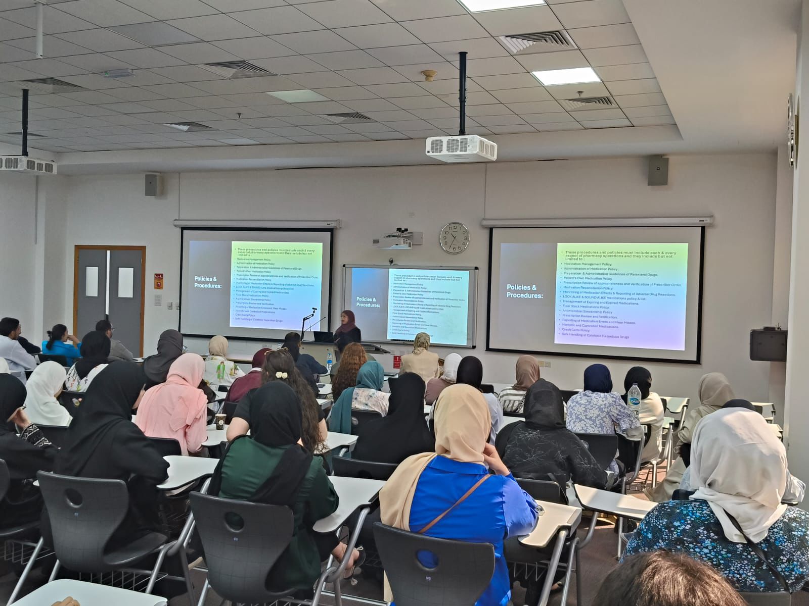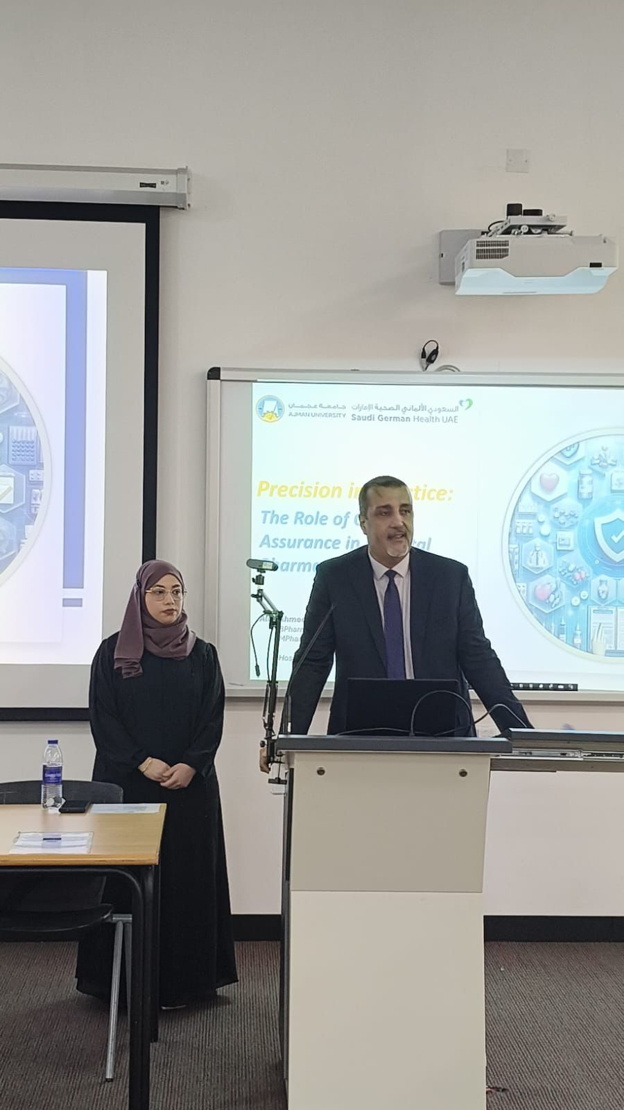 The event which was introduced by Dr. Akram Ashames and presented by Ms. Alaa Taalab, an AU alumna, MSc student and a hospital Pharmacist at the Saudi German Hospital at Ajman. Ms. Alaa discussed the various aspects and principles of Quality assurance in a Hospital Pharmacy setting. She highlighted the importance of Quality in health care and in pharmacy services provided for patients. The speaker discussed the importance of having policies and procedures in Hospital Pharmacy and gave examples. In addition, the speaker talked about how data is collected in a Hospital Pharmacy Setting where it is analyzed and outcomes are measured to improve the quality of the pharmacy services. The speaker highlighted how technology is utilized to extract data and monitor medication errors. Moreover, the speaker discussed the leadership role and how a pharmacy manager should lead with example when it comes to providing quality pharmacy practice. Finally, the speaker highlighted career opportunities in health care and pharmacy quality and some educational pathways for students in the field of Quality in health care.