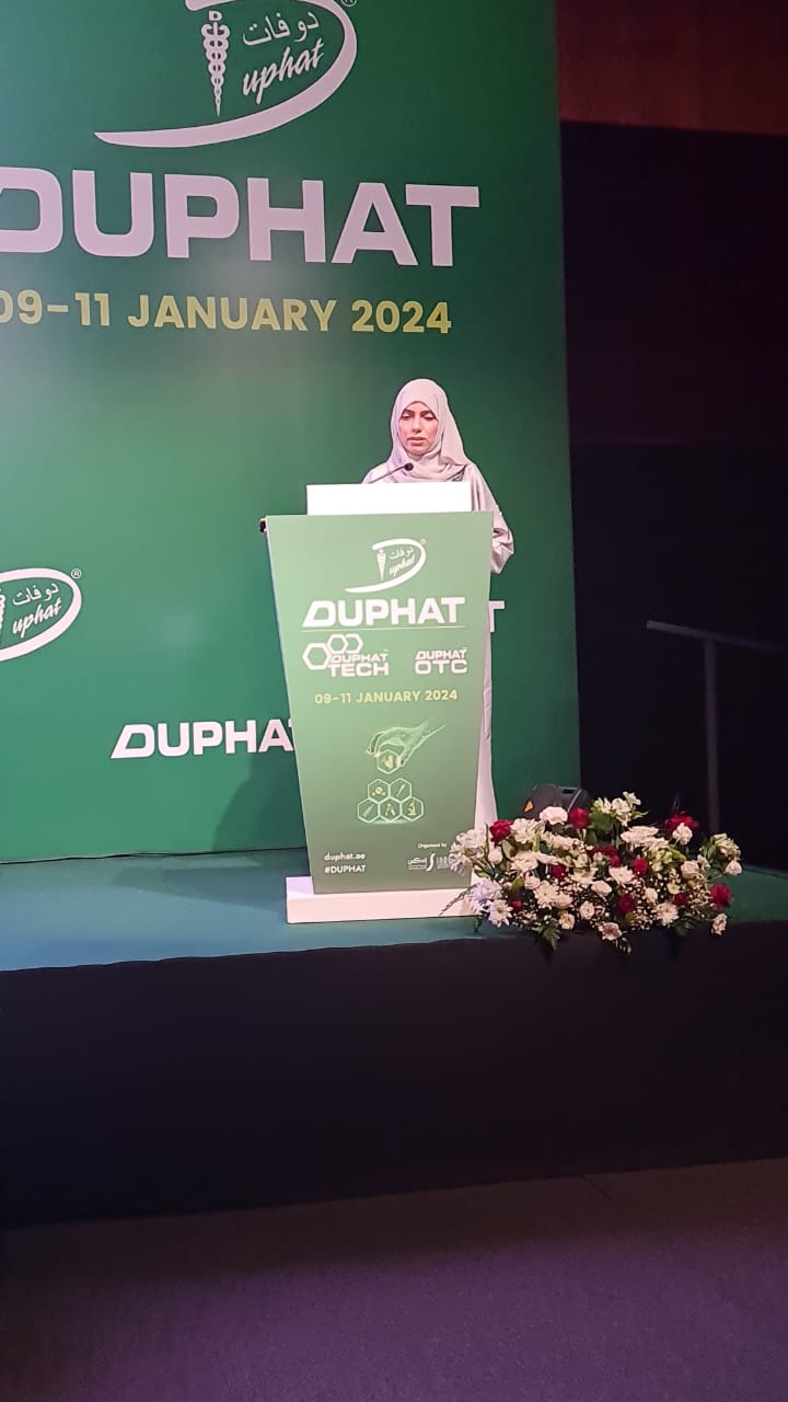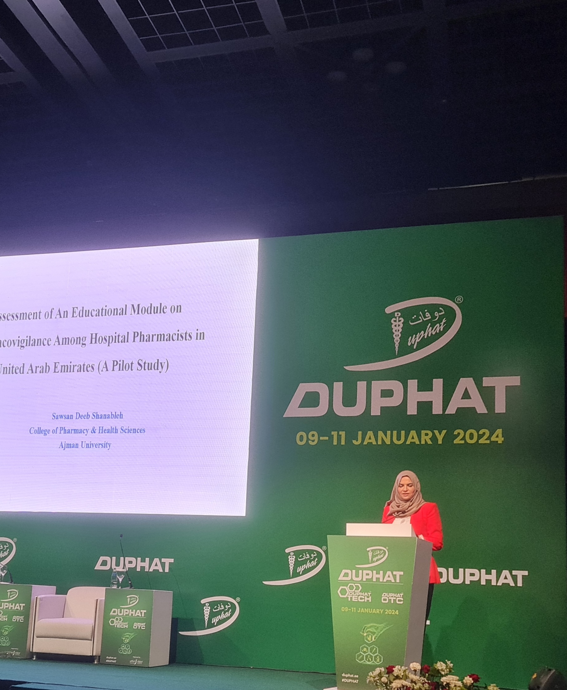 Two college instructors additionally took part in professional poster presentations. A pilot study to determine the viability of a pharmacovigilance educational module for hospital pharmacists in the United Arab Emirates was presented by Dr. Sawsan Shanableh under the title "Assessment of An Educational Module on Pharmacovigilance Among Hospital Pharmacists in United Arab Emirates (A Pilot Study)". Dr. Alaa Farajallah gave a presentation titled "Knowledge, Perception, Practices, and Barriers Towards Medication Reconciliation Process by Hospital Pharmacists in the United Arab Emirates: A Nationwide survey." In this talk, she discussed the findings of a cross-sectional survey that was conducted to evaluate hospital pharmacists' perceptions and levels of knowledge regarding medication reconciliation in the UAE.