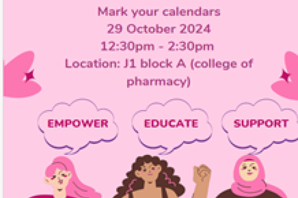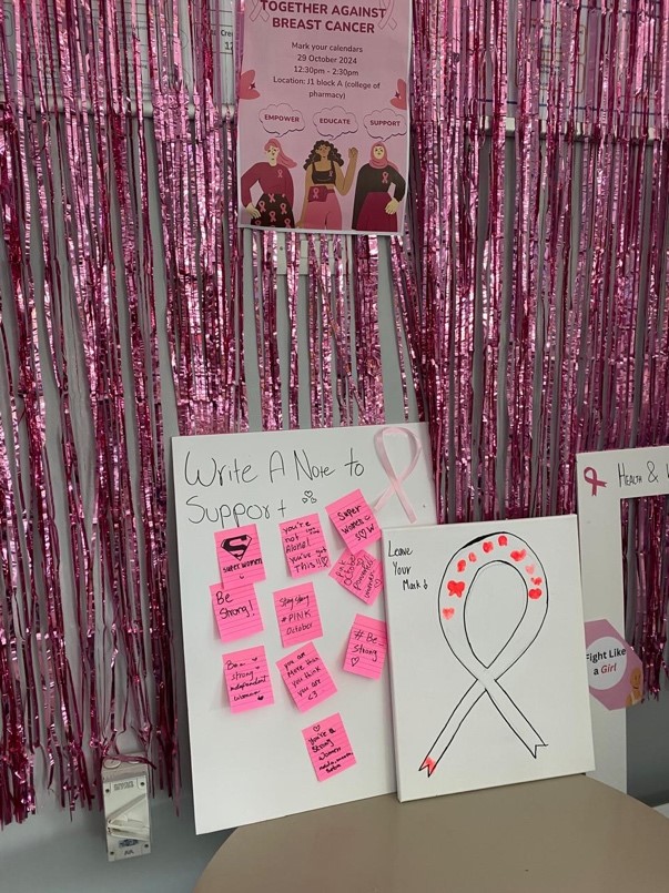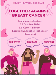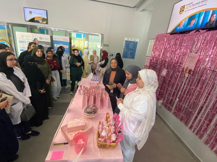The Health and Wellness Club at Ajman University recently hosted a breast cancer awareness event to educate students and the community about the importance of early detection and prevention of Breast Cancer. The event featured informative sessions and interactive activities that focused on raising awareness about breast cancer and promoting healthy lifestyle choices. Participants engaged in discussions and learned about the significance of regular screenings, fostering a supportive atmosphere centered on health and wellness.