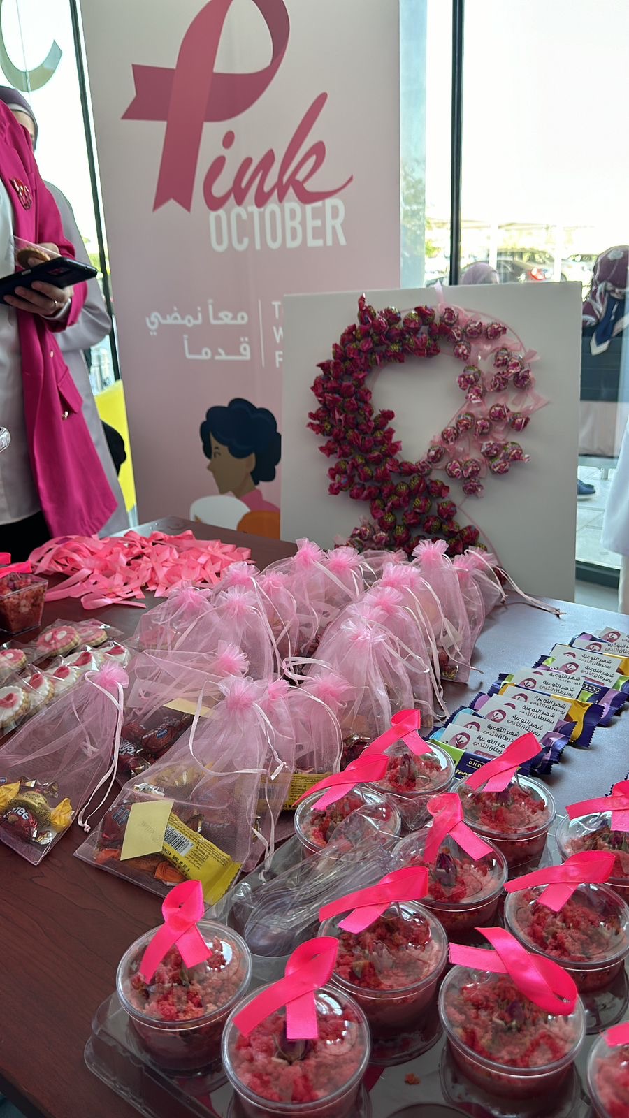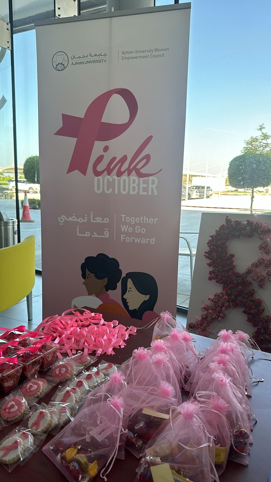 During Breast Cancer Awareness Month, nursing students from the College of Pharmacy and Health Sciences (COPHS) and the Nursing Student Club joined AUWEC's campaign to educate women in AU community on the importance of early breast cancer detection. Under the supervision of Dr. Deema Mahasneh and Ms. Ala’a Al Amiry, students shared self-examination techniques, emphasizing that early detection boosts survival rates. Leaflets with exam schedules and symptom checklists were distributed, and participants practiced on manikin models, receiving giveaways to commemorate the event.