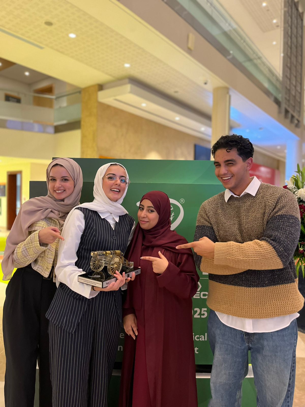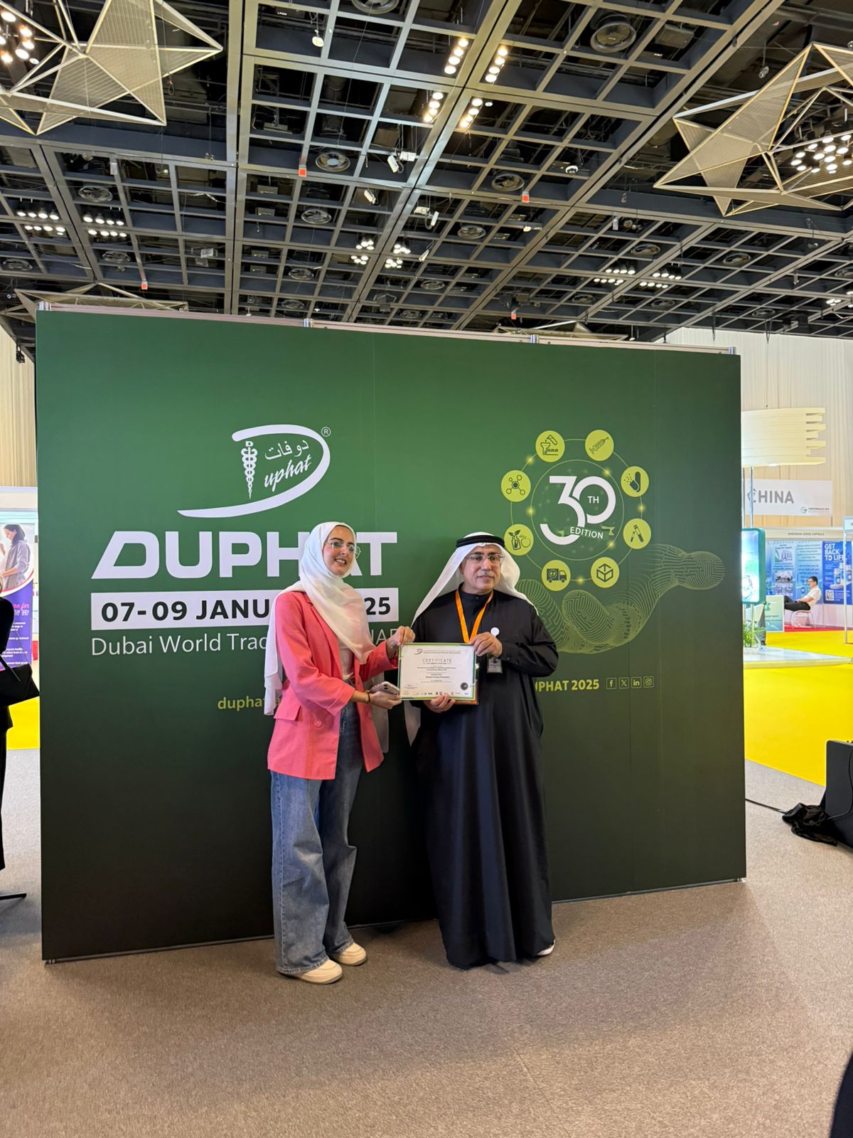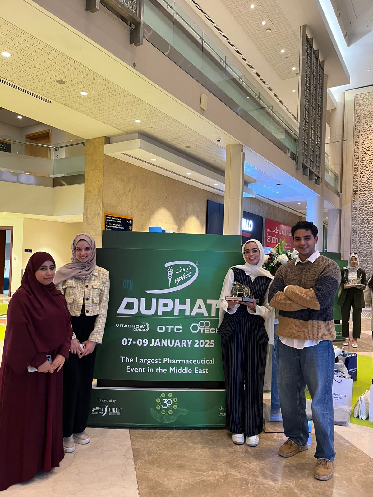 A research team from The College of Pharmacy and Health Sciences has been awarded First Place in the Display category at the prestigious DUPHAT 2025 Student Poster Competition for their study, “The Role of Gut Microbiota in Enhancing Colorectal Cancer Immunotherapy Efficacy.” The team consisted of the students Hana Mohamed, Doaa Al-Alimi, Maryam Hamed and Laith Badwan and supervised by Professor Abeer AlGhananeem, Dean of the College of Pharmacy and Health Sciences.
