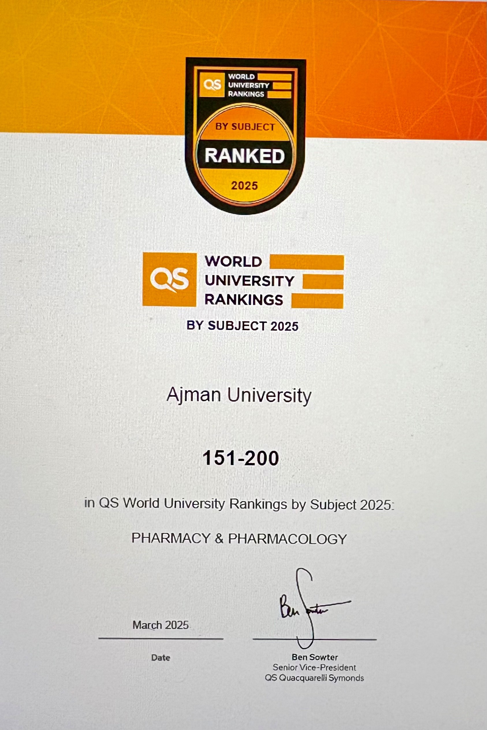 Ajman University’s College of Pharmacy and Health Sciences (COPHS) has achieved a significant milestone in the prestigious QS World University Rankings by Subject 2025, securing a place in the 151-200 range globally for Pharmacy & Pharmacology. This accomplishment also marks COPHS as the #1 ranked institution in the UAE in this field.