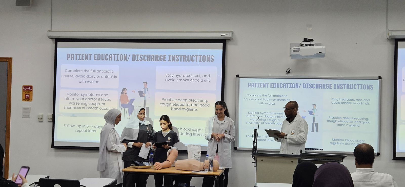 The College of Pharmacy and Health Sciences (COPHS) at Ajman University hosted a focused Interprofessional Education (IPE) activity in which senior Pharmacy and Nursing students jointly presented a complex pneumonia case. The session demonstrated the essential value of teamwork, communication, and shared decision-making in delivering high-quality patient care.