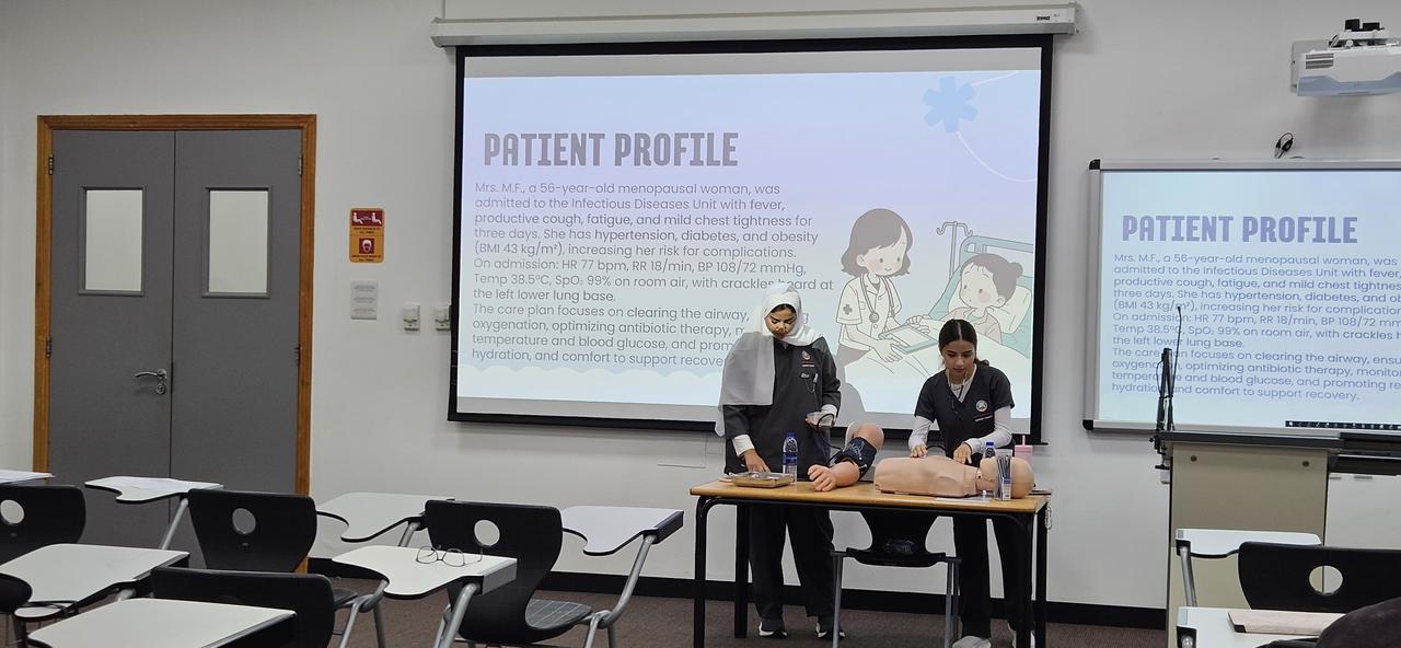 Mentored by Mr. Ahmed Gaili from the Department of Clinical Sciences, the interprofessional team delivered a coordinated presentation. Nursing students led the Nursing Care Plan, emphasizing assessment and supportive care, while Pharmacy students presented the Pharmaceutical Care Plan, identifying and resolving drug therapy-related problems. The activity highlighted core IPE competencies, including role clarification, active communication, and collaborative problem-solving, offering students a realistic simulation of multidisciplinary clinical practice.