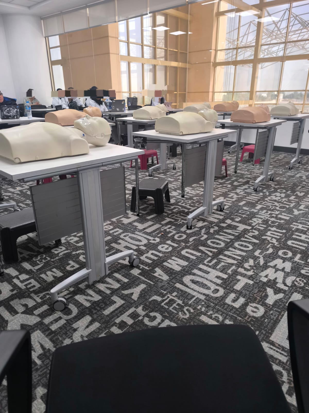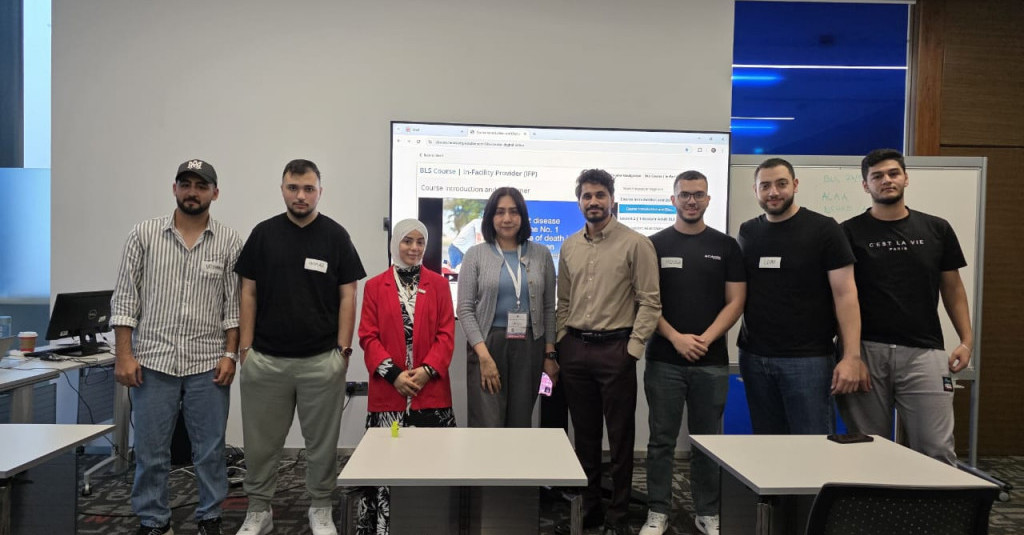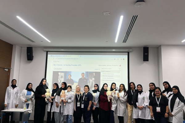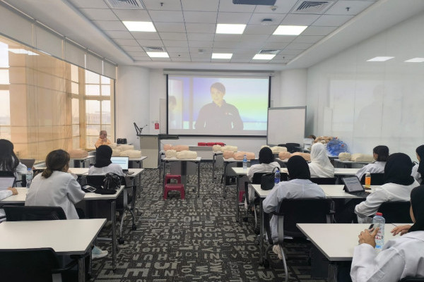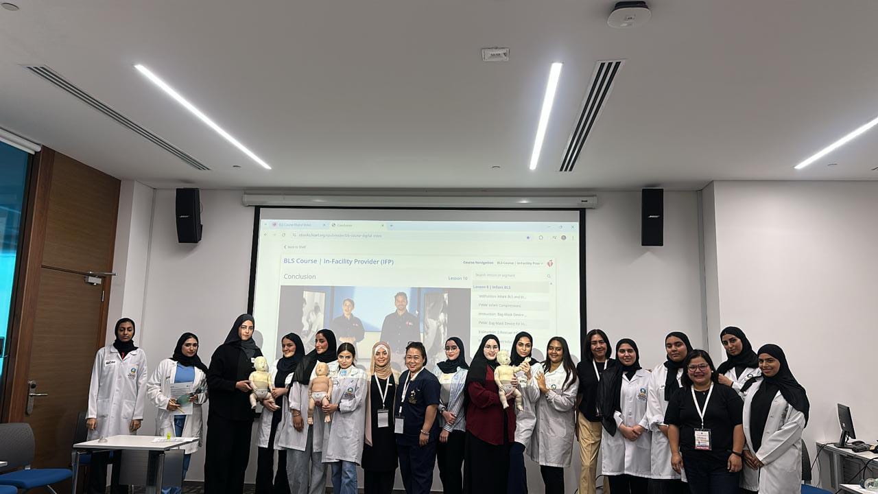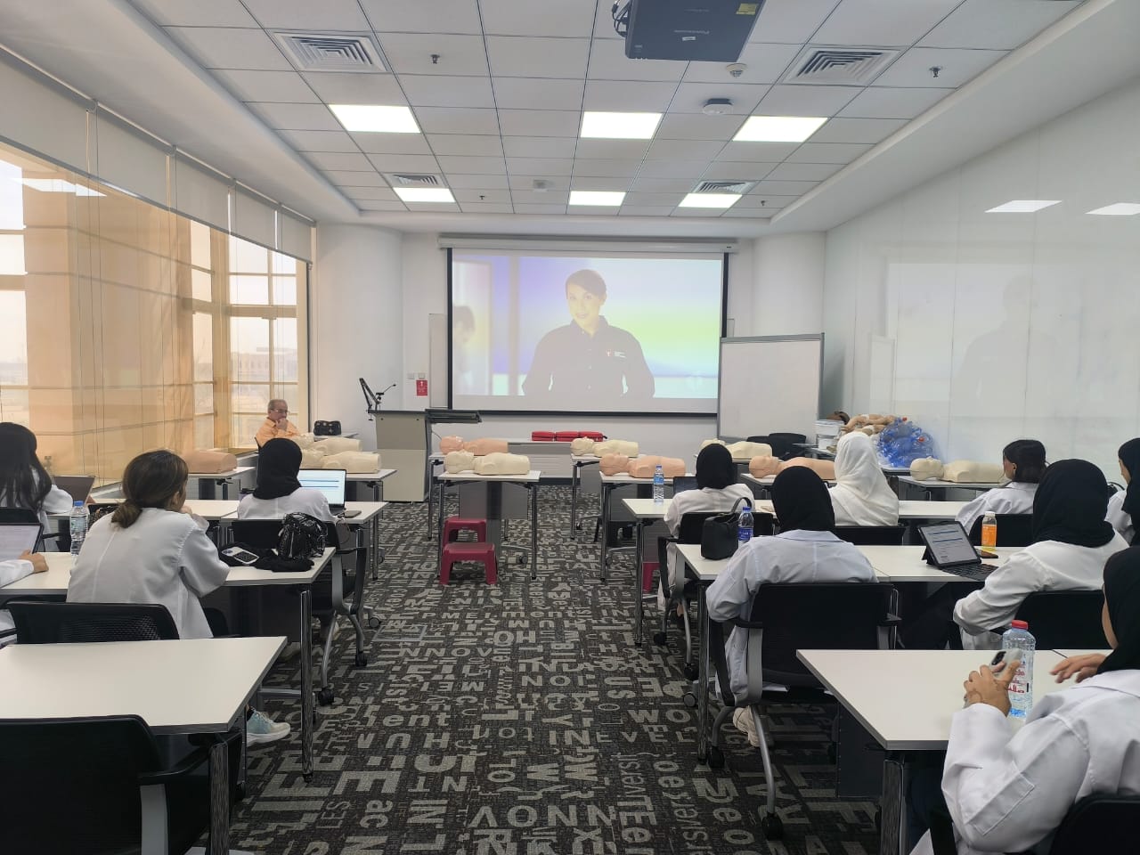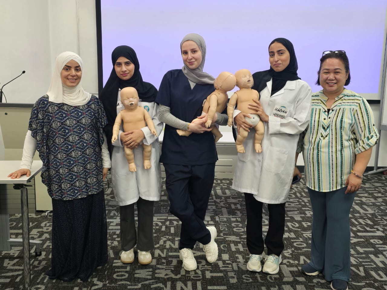 The College of Pharmacy and Health Sciences (COPHS) conducted three Basic Life Support (BLS) workshops on campus for second-year BSN students, in collaboration with the AHA Training Center at Sheikh Khalifa General Hospital, UAQ. The sessions were co-delivered by Mrs. Alaa Al Amiry, an AHA-certified instructor affiliated with the Training Center, alongside other certified instructors. This initiative, led by the Nursing Department under Dr. Deema Mahasneh’s direction, aims to prepare students for clinical training, as BLS certification is a prerequisite. All 51 participating students successfully completed the training and received their two-year valid BLS certificates.